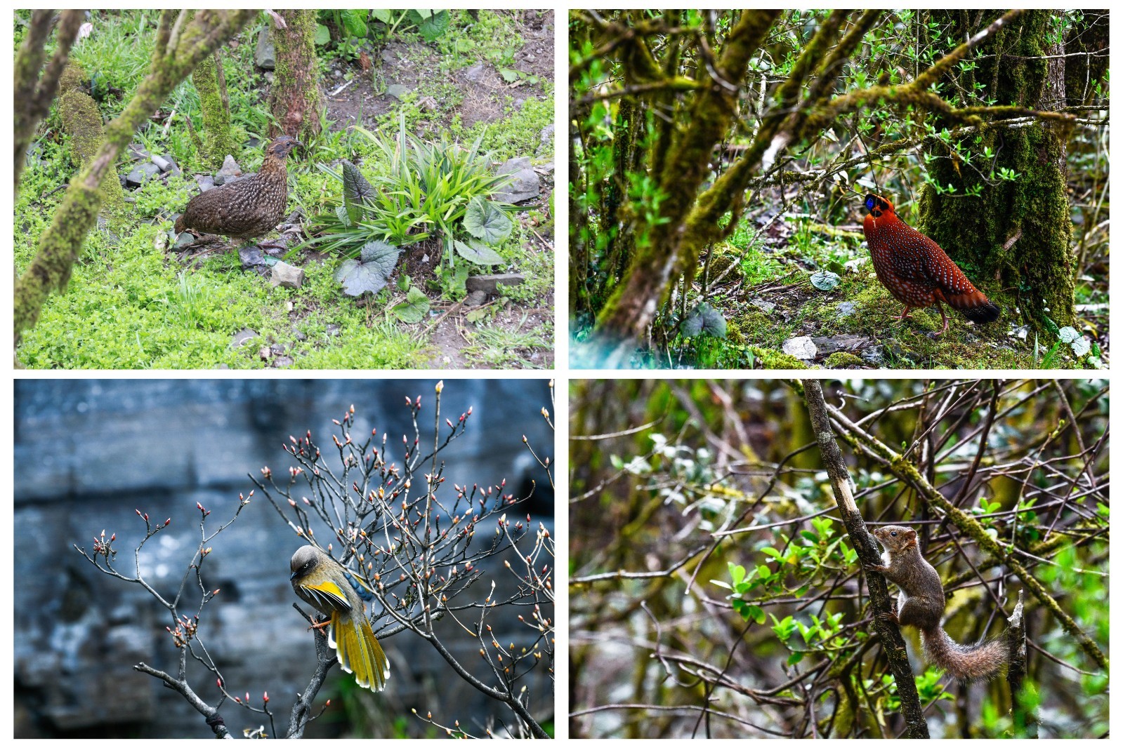 4月20日在贵州梵净山国家级自然保护区拍摄的小动物。左上图为红胸角雉雌鸟(新华社发 李鹤 摄);左下图为橙翅噪鹛(新华社记者 杨文斌 摄);右上图为红胸角雉雄鸟(新华社记者 杨文斌 摄);右下角为松鼠(新华社记者 杨文斌 摄)。