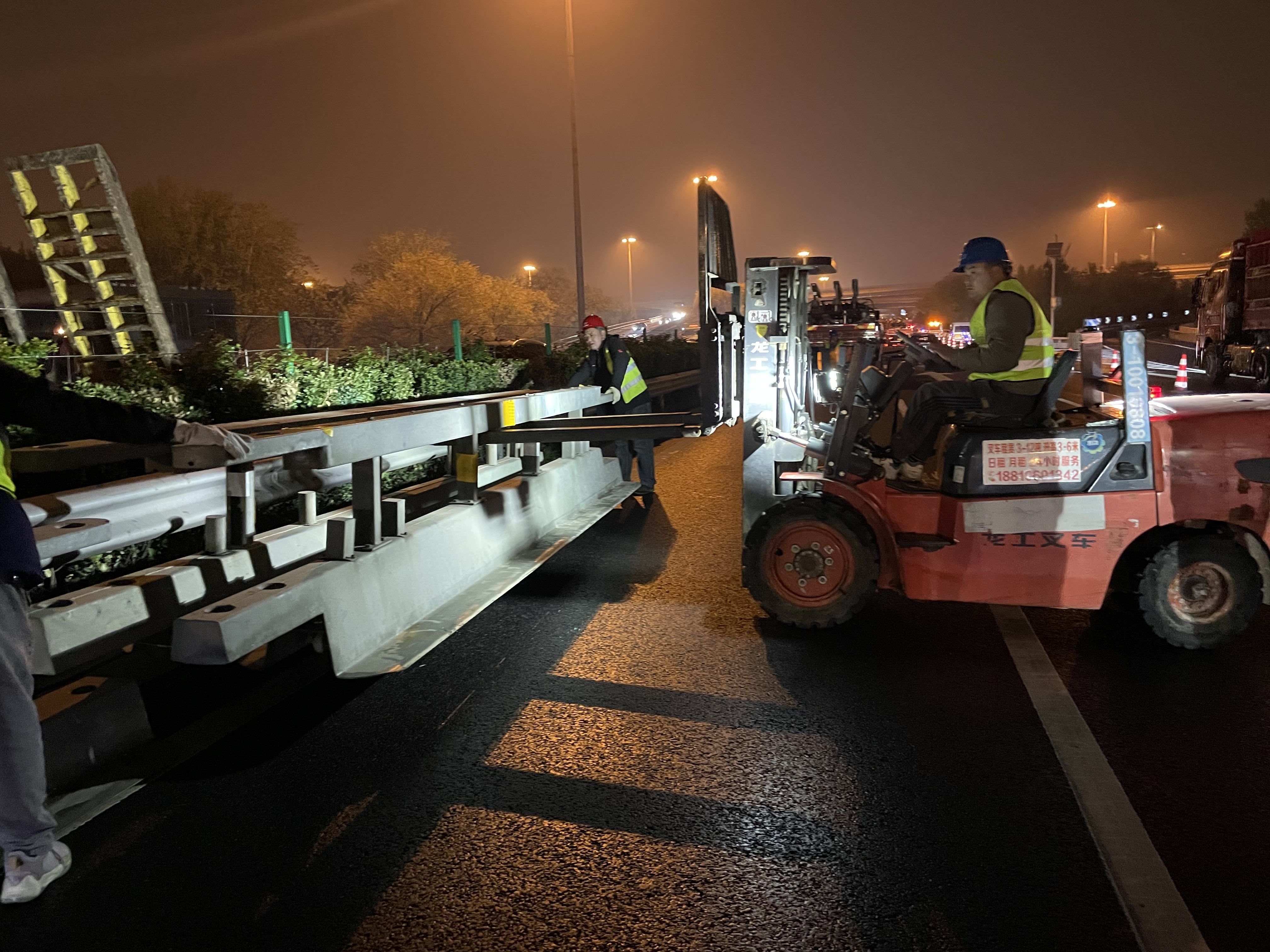 零点过后,施工导行启动了一项“大工程”——在叉车的行进配合下,将提前备好的一节节钢护栏放置在四元桥系四环路外环(逆时针方向)路面中间,将同方向四条车道临时隔离成两上两下,以此保证内环(顺时针方向)封闭施工的48小时内车辆可以“借道”通行。