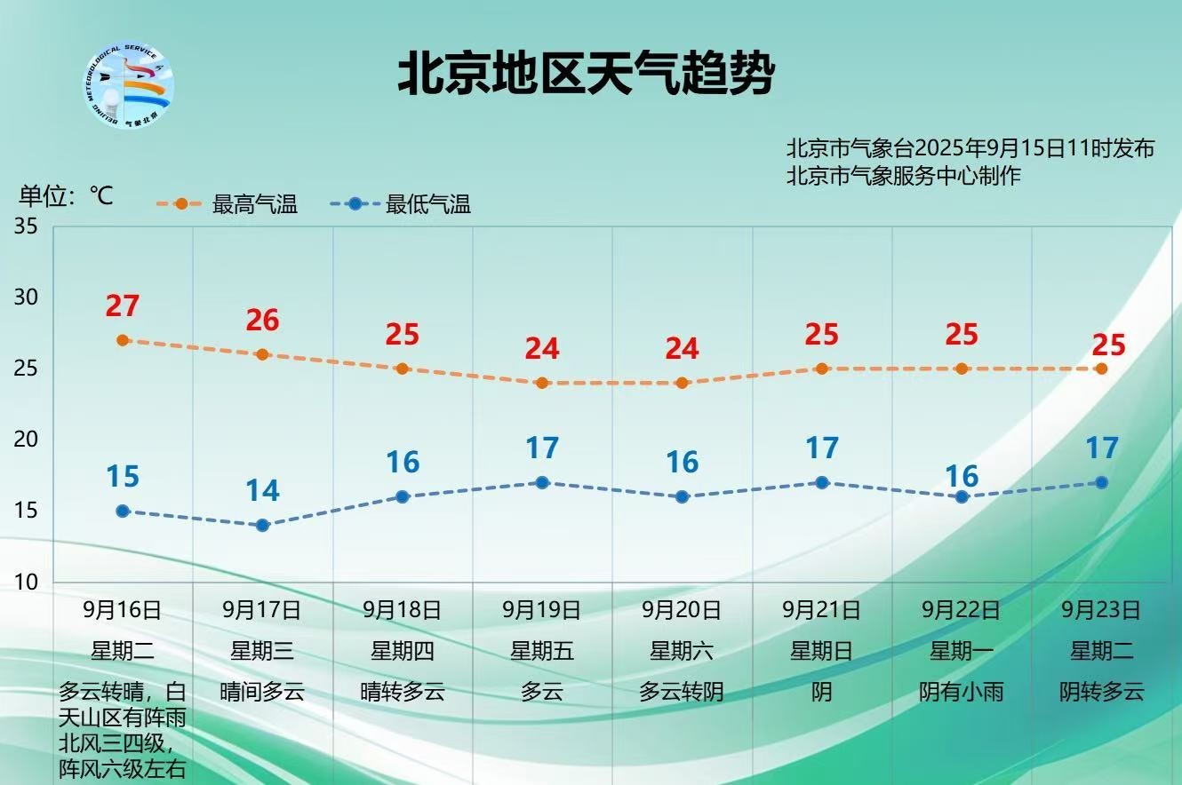 今天白天多云,山区有阵雨,北风三四级,阵风六七级,最高气温26℃;夜间多云转晴,北风一二级,最低气温15℃。大风蓝色预警中,今天北风较大,外出注意防风,谨防高空坠物。