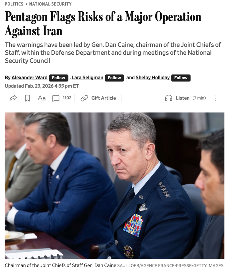 △《华尔街日报》报道,美国参谋长联席会议主席凯恩将军指出,正在考虑的战争计划存在风险