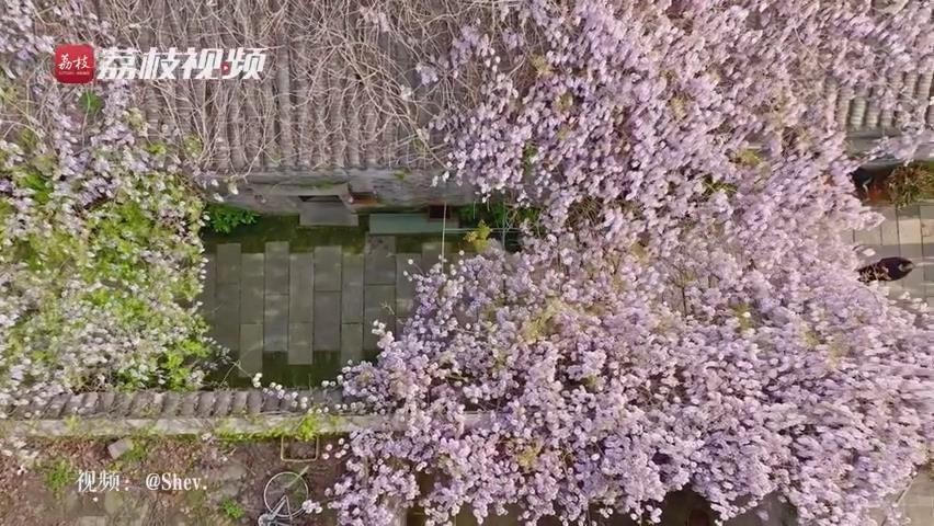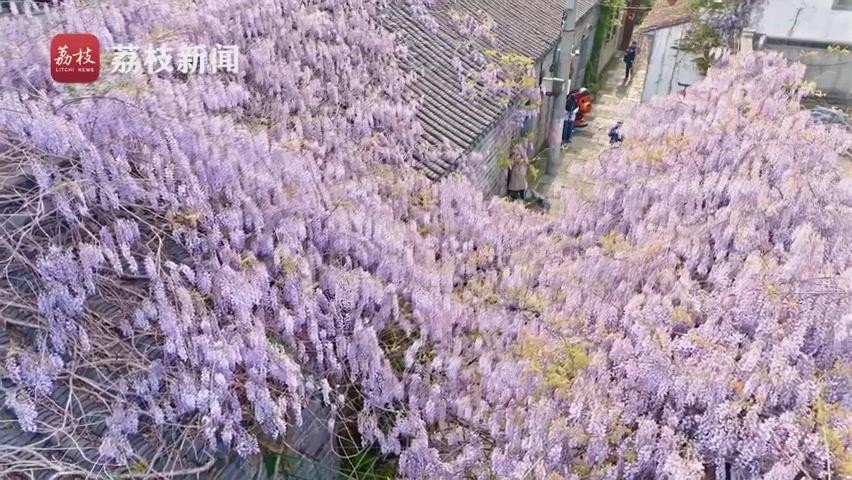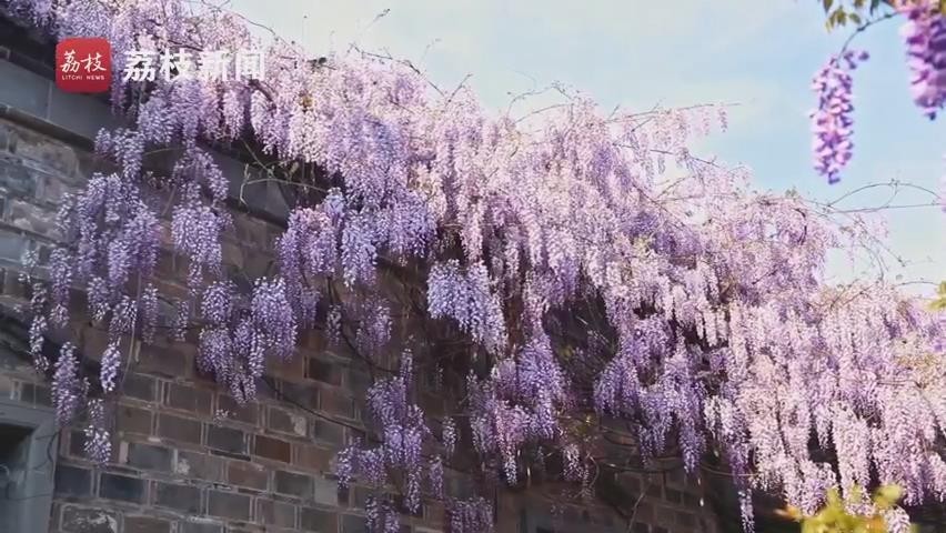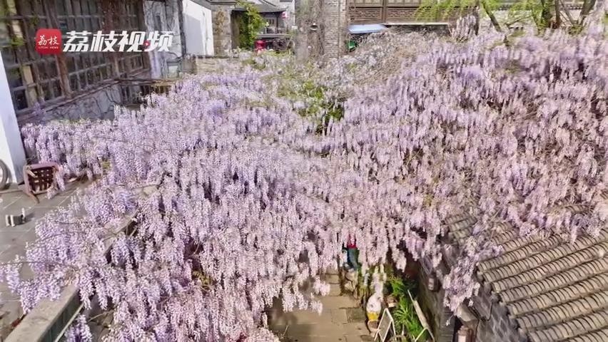 近日,在南京网红打卡地,老门东 “最美屋檐”的紫藤盛开,一簇簇紫藤花浪漫盛放,从屋檐上倾泻而下,远远望去,宛若一片紫色瀑布,又似群蝶飞舞。一阵春风吹来,紫藤花摇曳生姿,淡淡花香沁人心脾,令人沉醉。