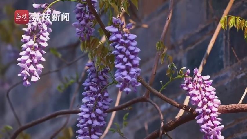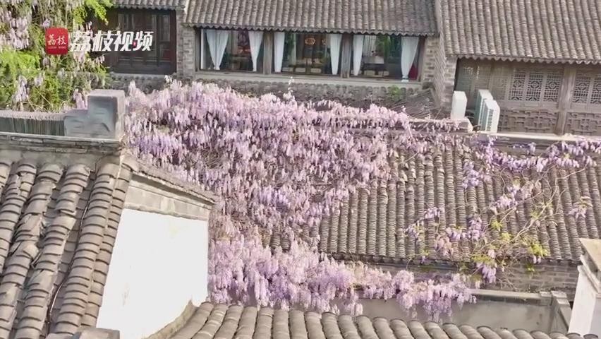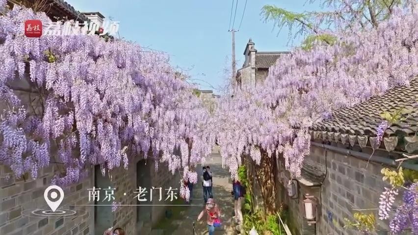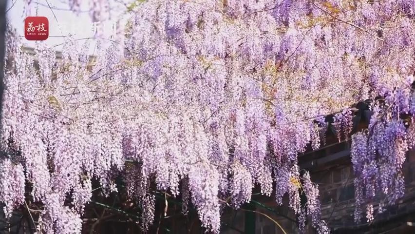 在南京网红打卡地,老门东 “最美屋檐”的紫藤盛开,一串串圆锥形的紫藤花,吊挂在藤上。吸引不少游客目光, 成为景区一道别致美景。