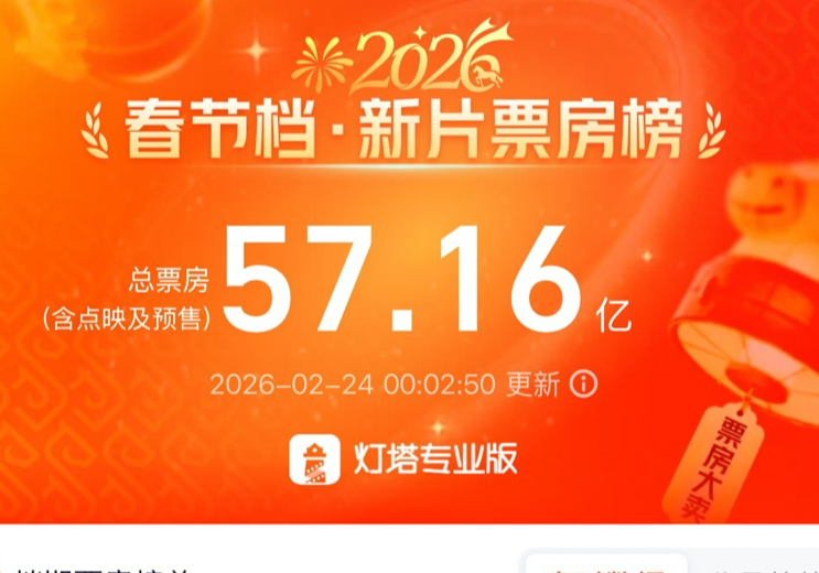 据灯塔专业版数据,截至2月23日24时,2026年春节档总票房突破57.16亿元。上海以1.93亿元的票房成绩再次蝉联全国城市票房排行第一。