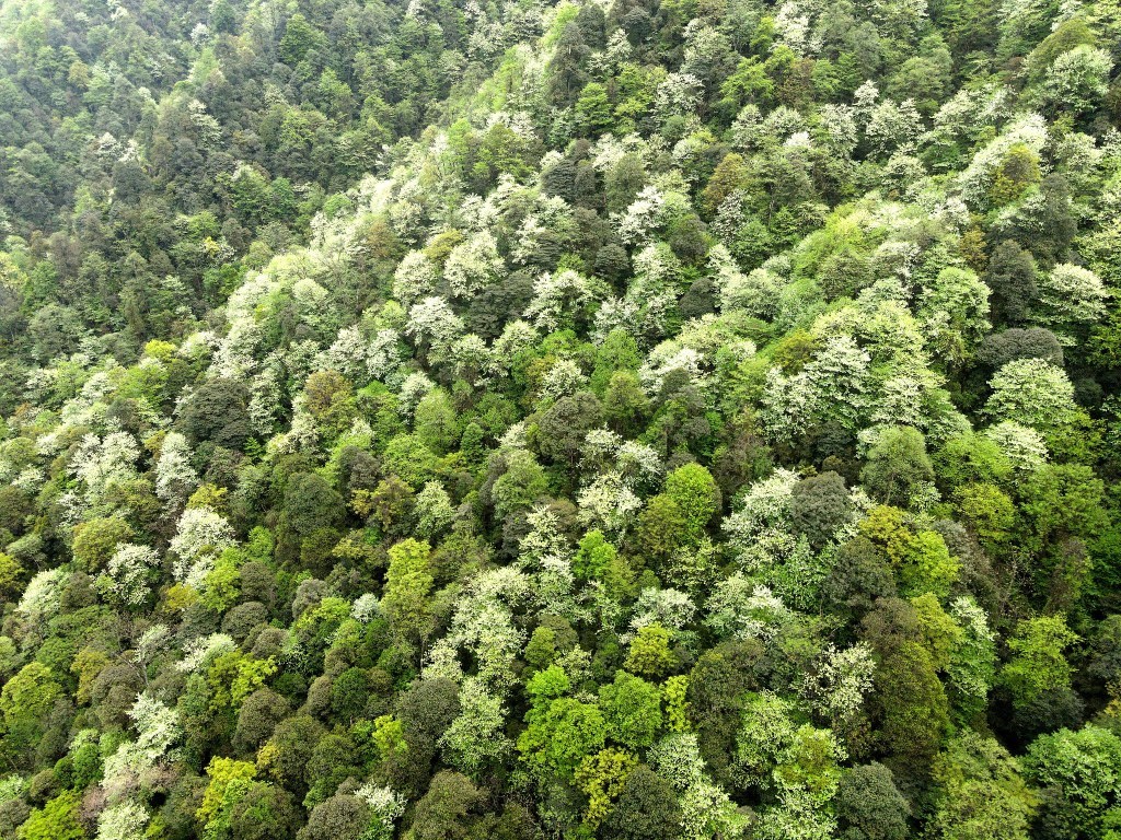 2025年4月20日,四川雅安,荥经县龙苍沟镇的山谷中,大片野生珙桐树沿着山谷两侧绽放。