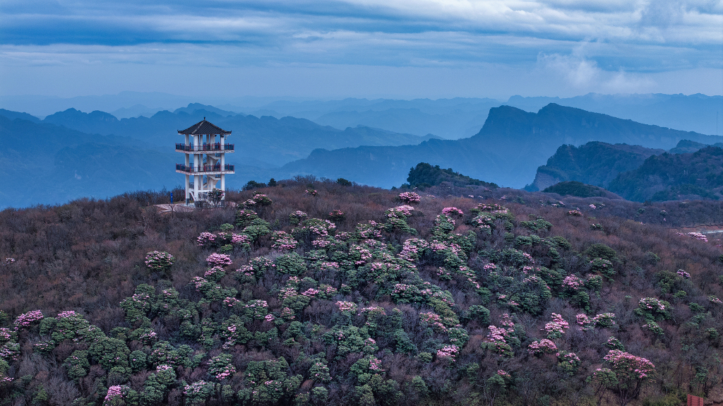 湖北黄冈,麻城龟峰山,杜鹃花海绽放,吸引众多游客前来观赏。拥有100多万亩杜鹃林,其中古杜鹃群落达10万多亩,是目前发现的中国最大的古杜鹃原始群落。