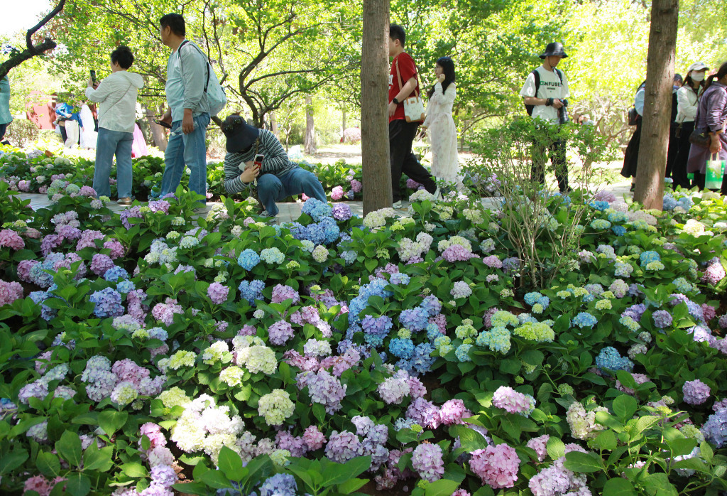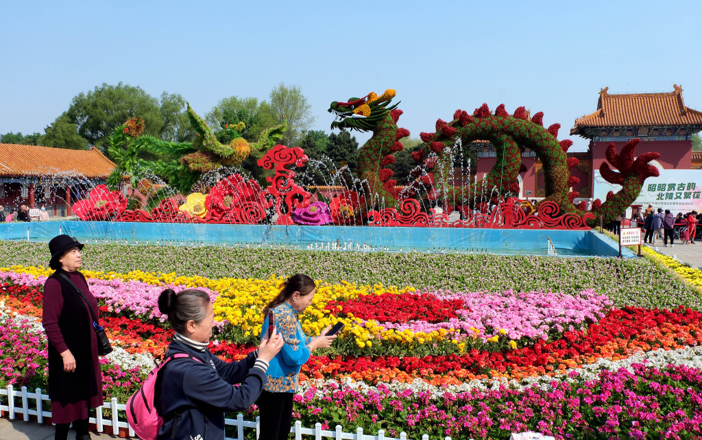 2025年4月28日,辽宁沈阳,游人在北陵公园花朝节赏花游玩拍照打卡。