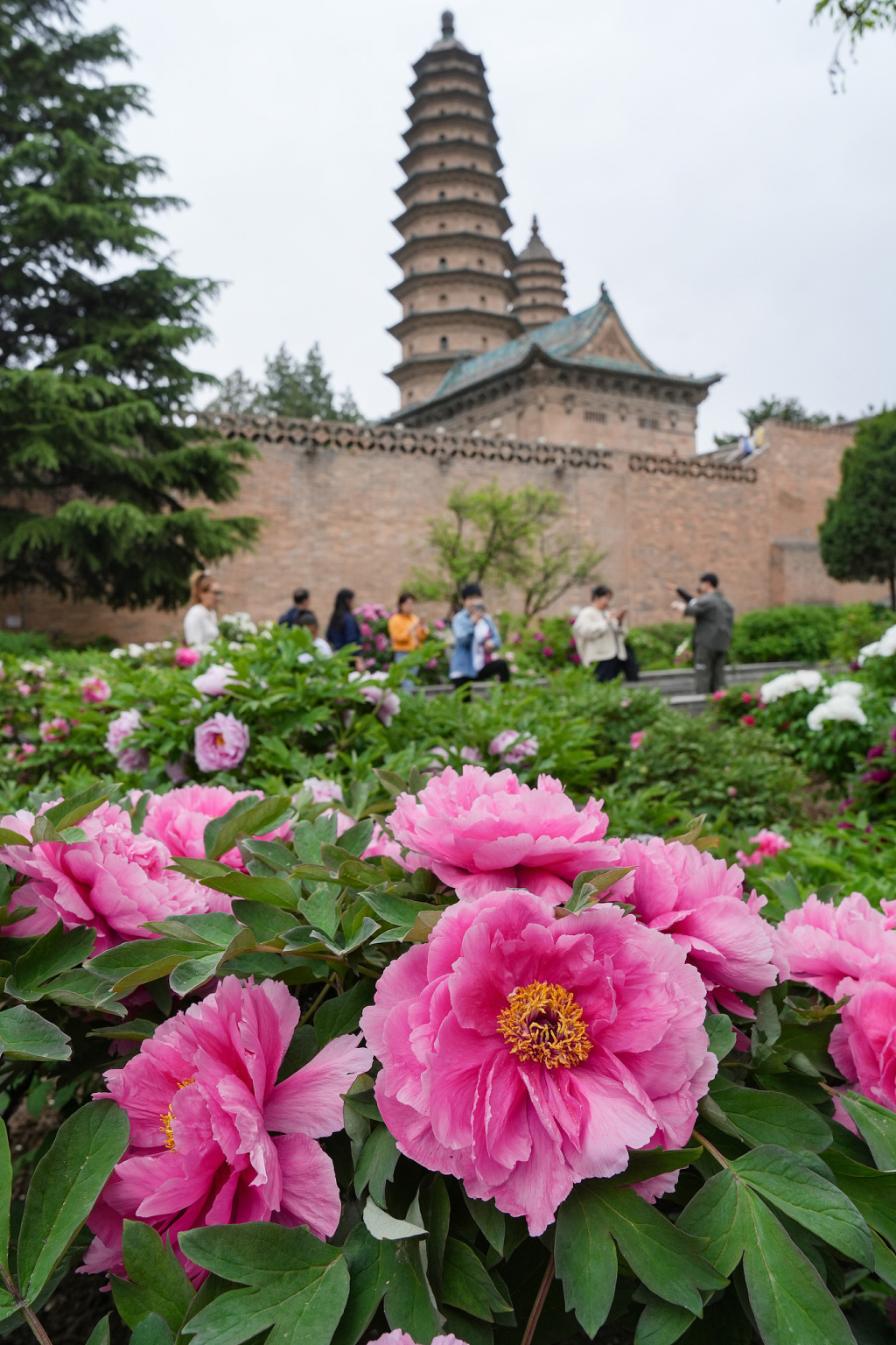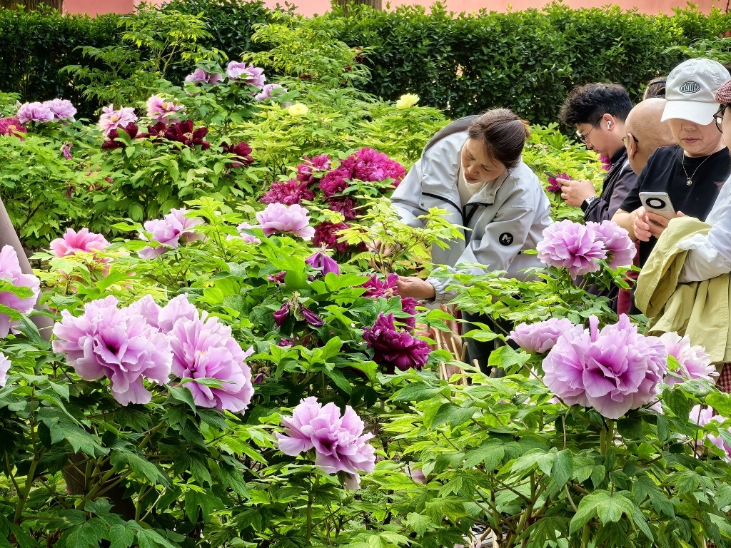 2025年4月26日,太原,双塔寺内牡丹争相绽放,吸引游客赏花拍照。