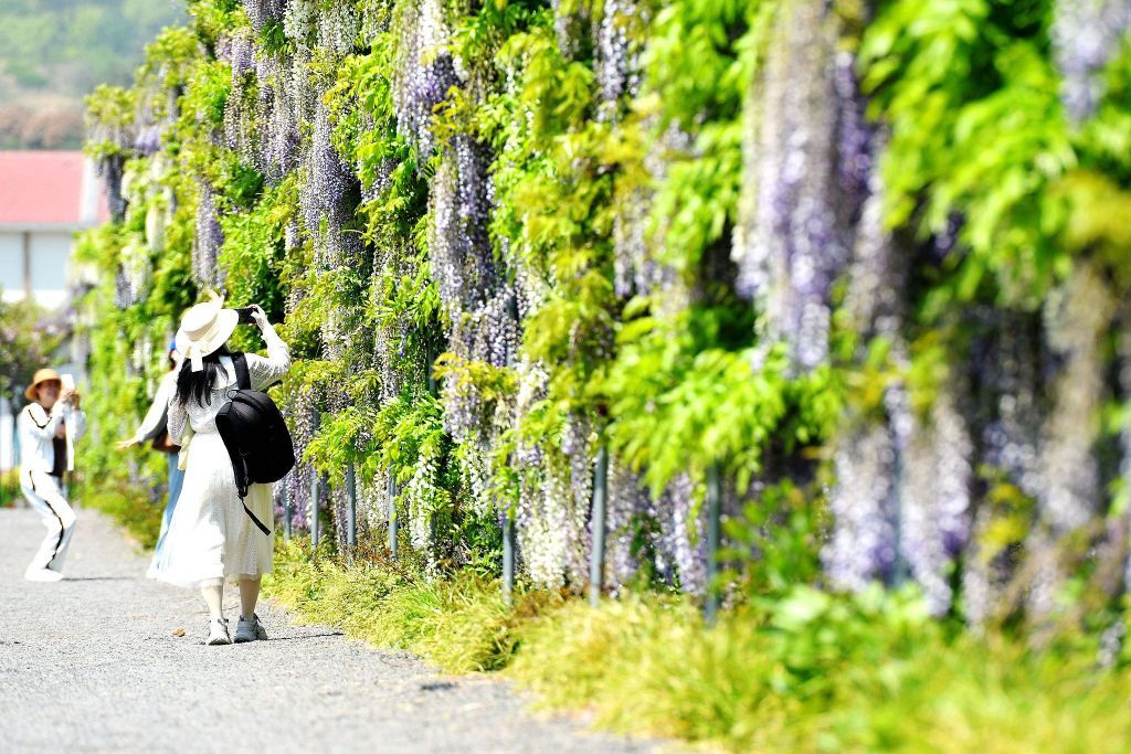 山东青岛无比方花园各种杜鹃花、紫藤花等鲜花盛开,鲜花与新绿将整个花园打扮成大自然的调色板,吸引众多游客和市民利用周末前来赏花。