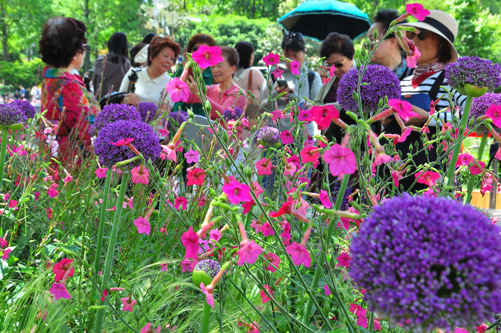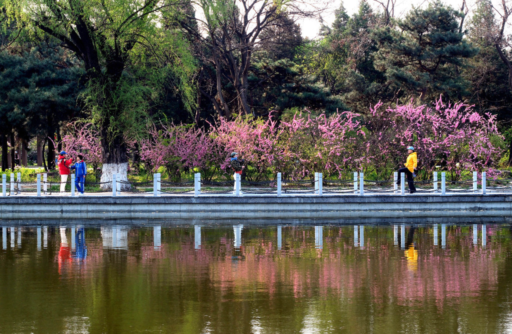 “五一”将至,各色花卉将天坛公园装扮一新,宛若“莫奈花园”,美不胜收,吸引市民游人驻足观赏拍照。