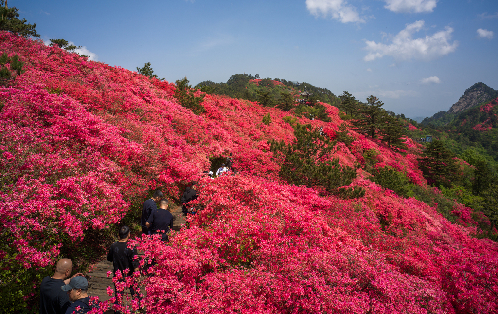 2025年4月25日,湖北黄冈,麻城龟峰山,杜鹃花海绽放,吸引众多游客前来观赏。
