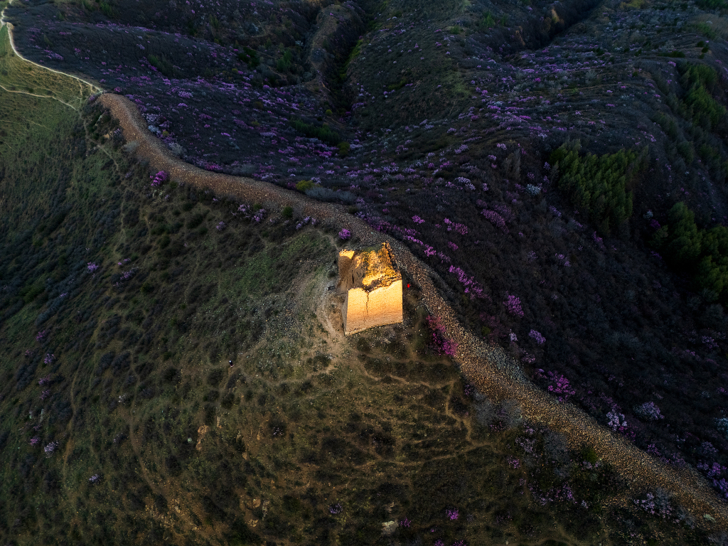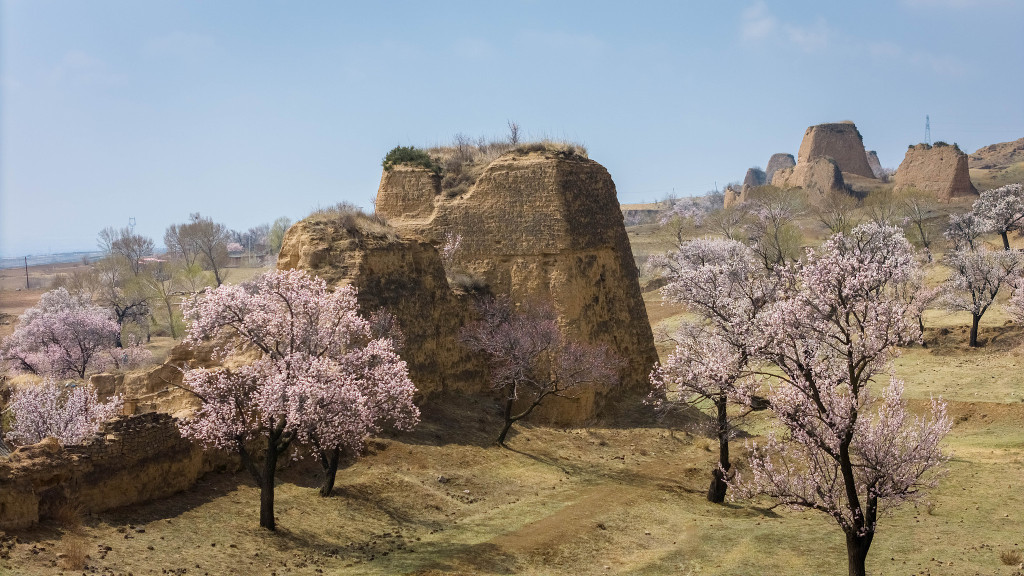 山西大同,白羊口长城内外杏花盛开,古老长城与繁花相映成趣,展示了黄土高坡上的春日美景。