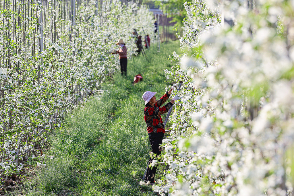 2025年4月14日,陕西省宝鸡市千阳县,果农为开花的苹果树疏花。