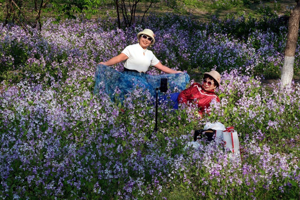 2025年4月28日,辽宁沈阳,游人在北陵公园花朝节赏花直播。