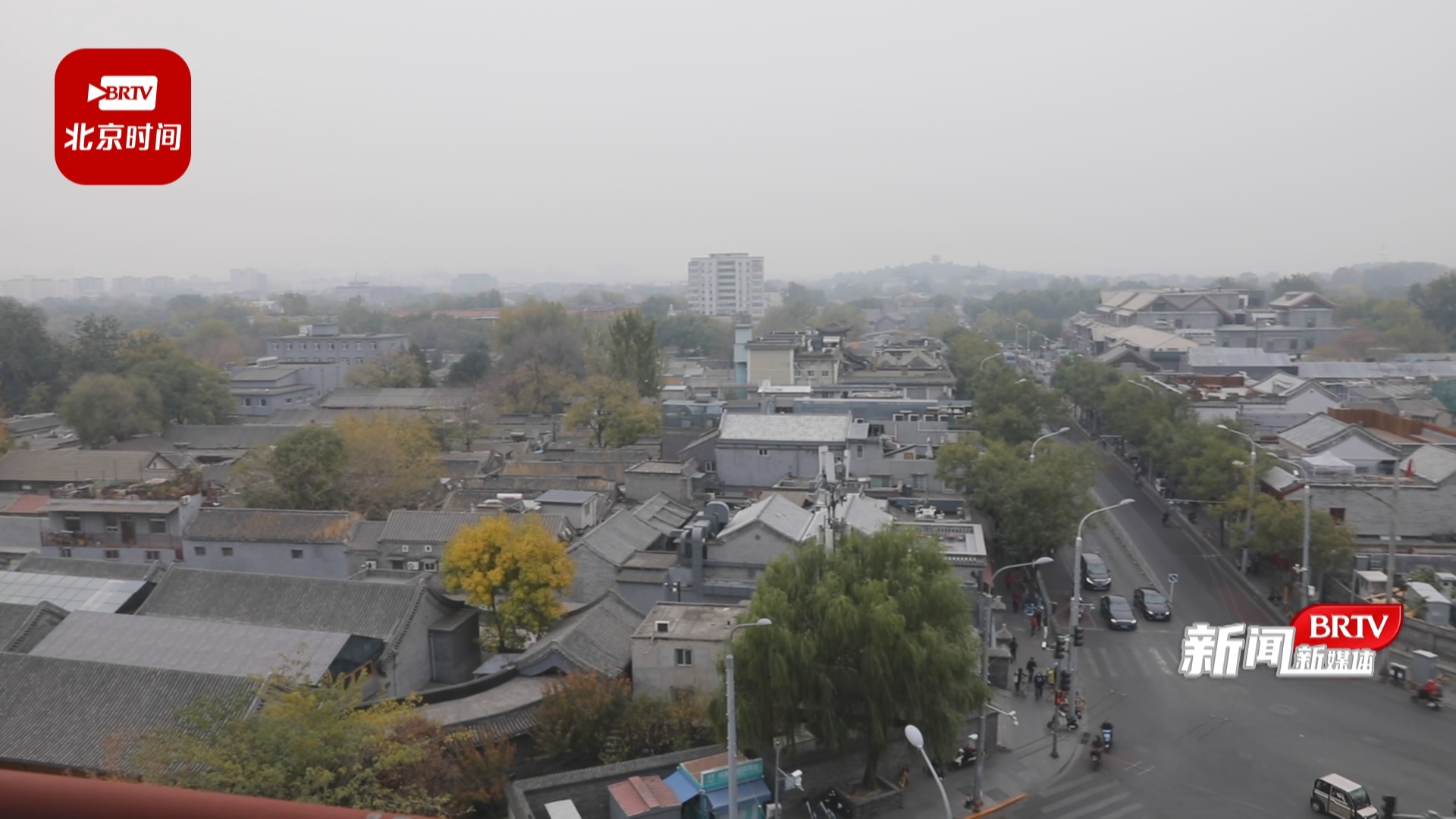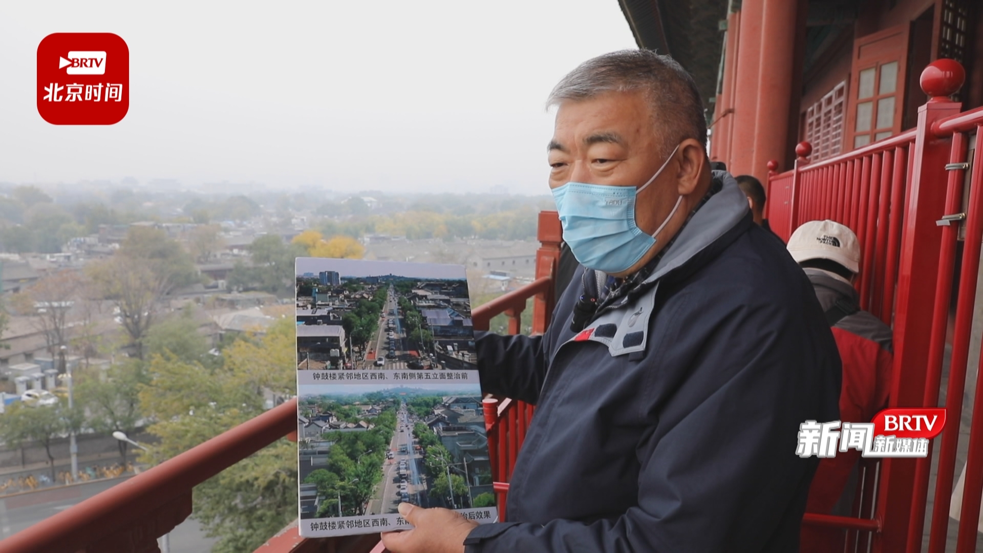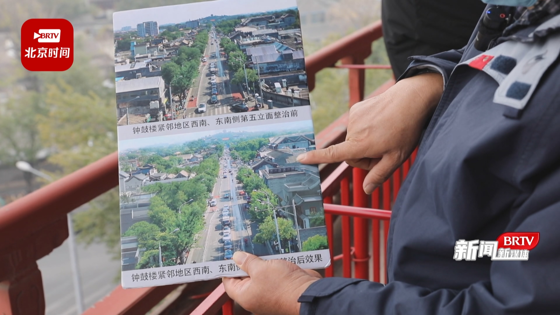 什刹海阜景街建设指挥部常务副总指挥 刘维岩:“这个是咱们钟鼓楼2021年4月原始的照片,整理好了以后,我们现在成了下面这个样子,中轴线周边的秩序基本上达到了左右对称。”