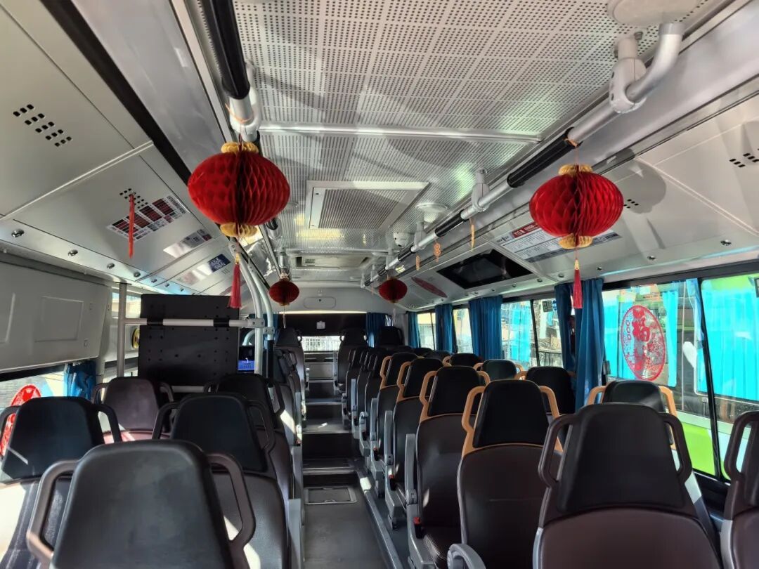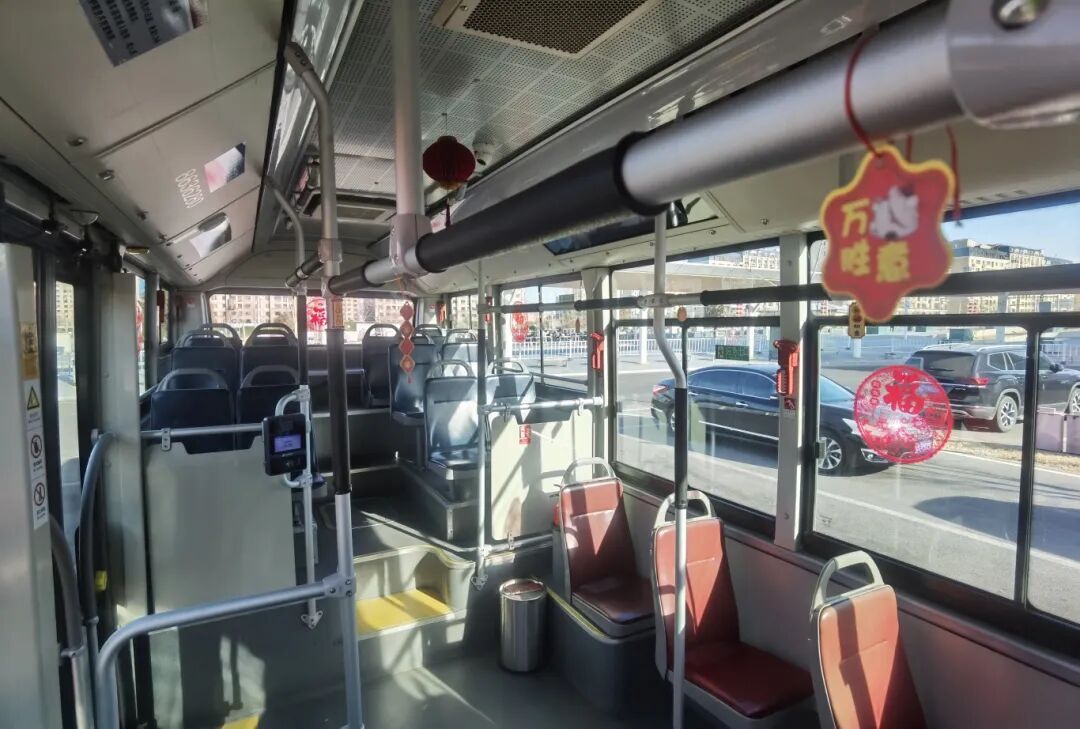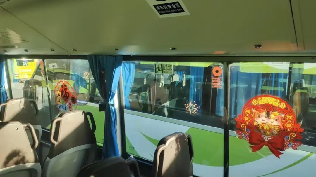 登上装扮一新的919快公交车,喜庆的中国红瞬间映入眼帘:车窗上贴着精致的福字窗花,扶手上系着象征吉祥的中国结,车顶悬挂的红灯笼随着车辆行驶轻轻摇曳。车厢内外早已完成细致清扫与全面消杀,一尘不染的环境搭配火红的装饰,让假日出行多了几分温馨。乘客们或望着窗外的延庆风光,或对着车厢装饰拍照留念,年味儿溢满车厢。
