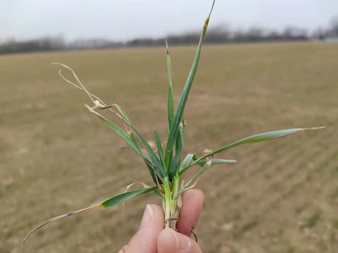 在木林镇前王各庄村的麦田,区农业技术综合服务中心副主任张爱军随机取了几棵麦苗,剥开外层的“冬衣”,可以看到麦苗内芯已经长出新叶。“这里有两个特别大的蘖加上主茎,我们认为它是壮苗标准。”张爱军说。