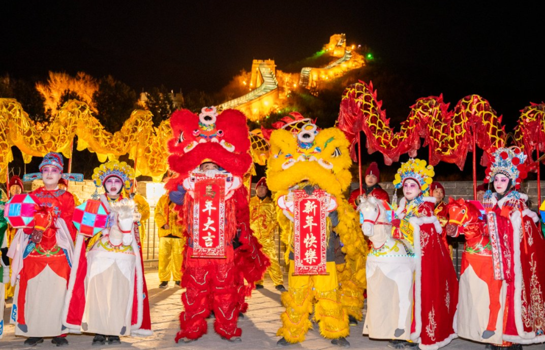 除夕至正月初六,八达岭夜长城焕彩亮相,成为景区的一大亮点。千盏华灯璀璨点亮雄关,将长城装点得如梦如幻。舞龙舞狮、旱船、竹马等非遗特色展演精彩纷呈。夜长城营业时间为18:00至21:00,全方位满足游客夜游登高体验,让游客在夜晚也能领略长城的独特魅力,感受浓浓的中国年味儿。