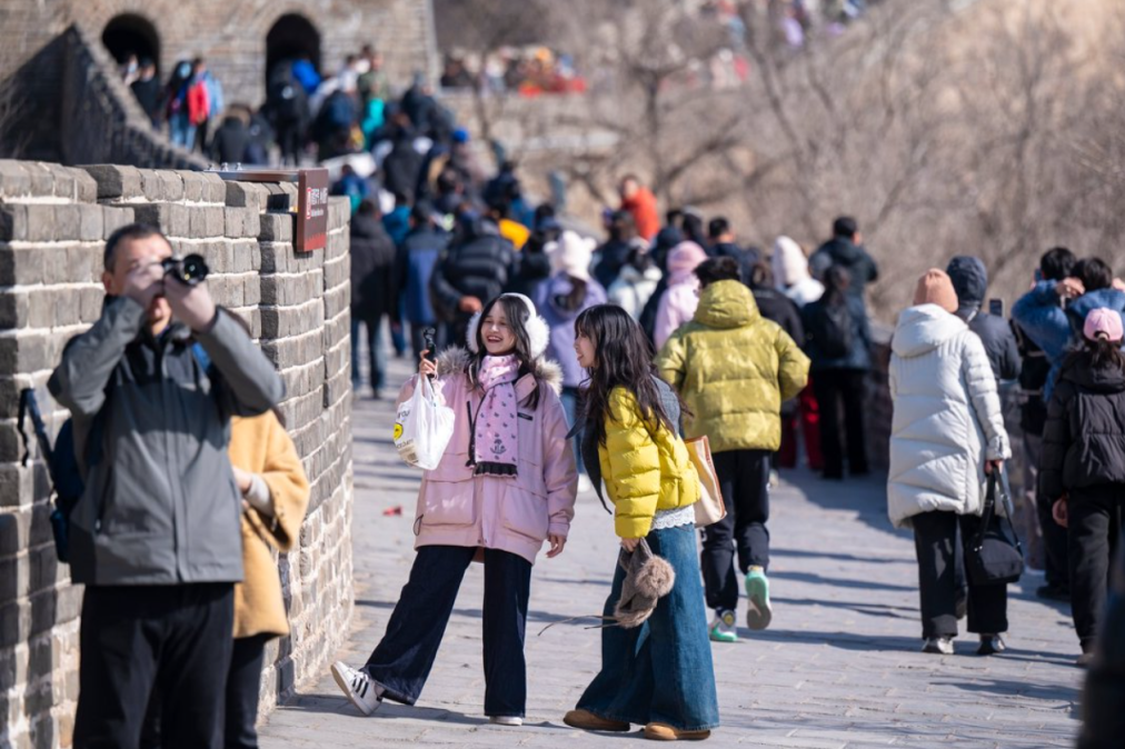 景区入口处,工作人员快速有序地检票,现场秩序井然。登城而上,不少游客来到“好汉碑”前拍照留念。春节期间的八达岭长城,虽少了夏季的郁郁葱葱,却多了几分苍劲与豪迈,在暖阳下更显雄伟壮观。