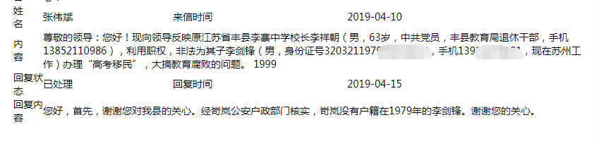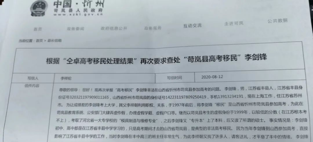 耐人寻味的是,大白新闻在山西忻州市岢岚县人民政府网站中发现,2019年4月10日,一位叫“张伟斌”的人也曾向县长信箱发件举报“李寨中学校长李祥朝为其子李剑锋办理高考移民”,该件显示状态为“已处理”,回复内容是“经岢岚公安户政部门核实,岢岚没有户籍在1979年的李剑锋。”