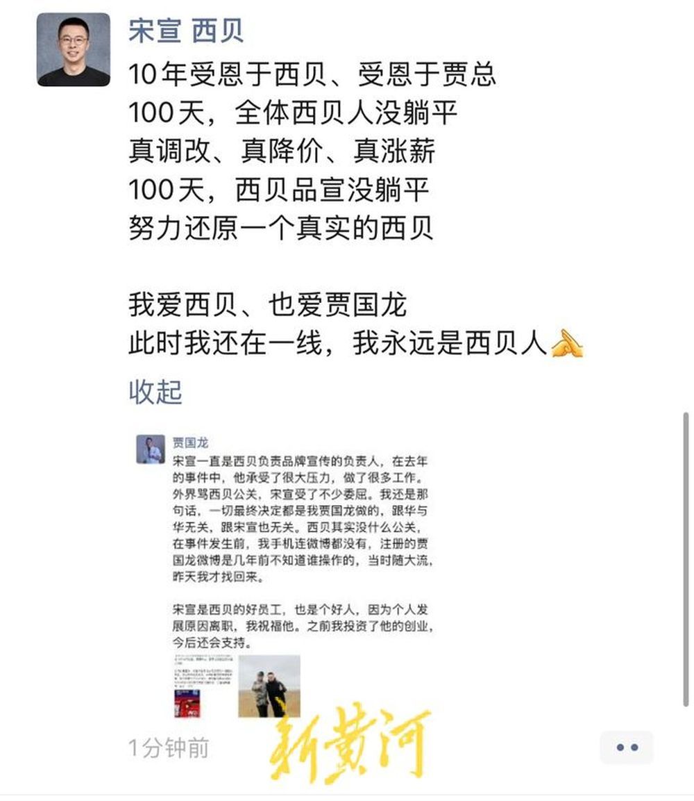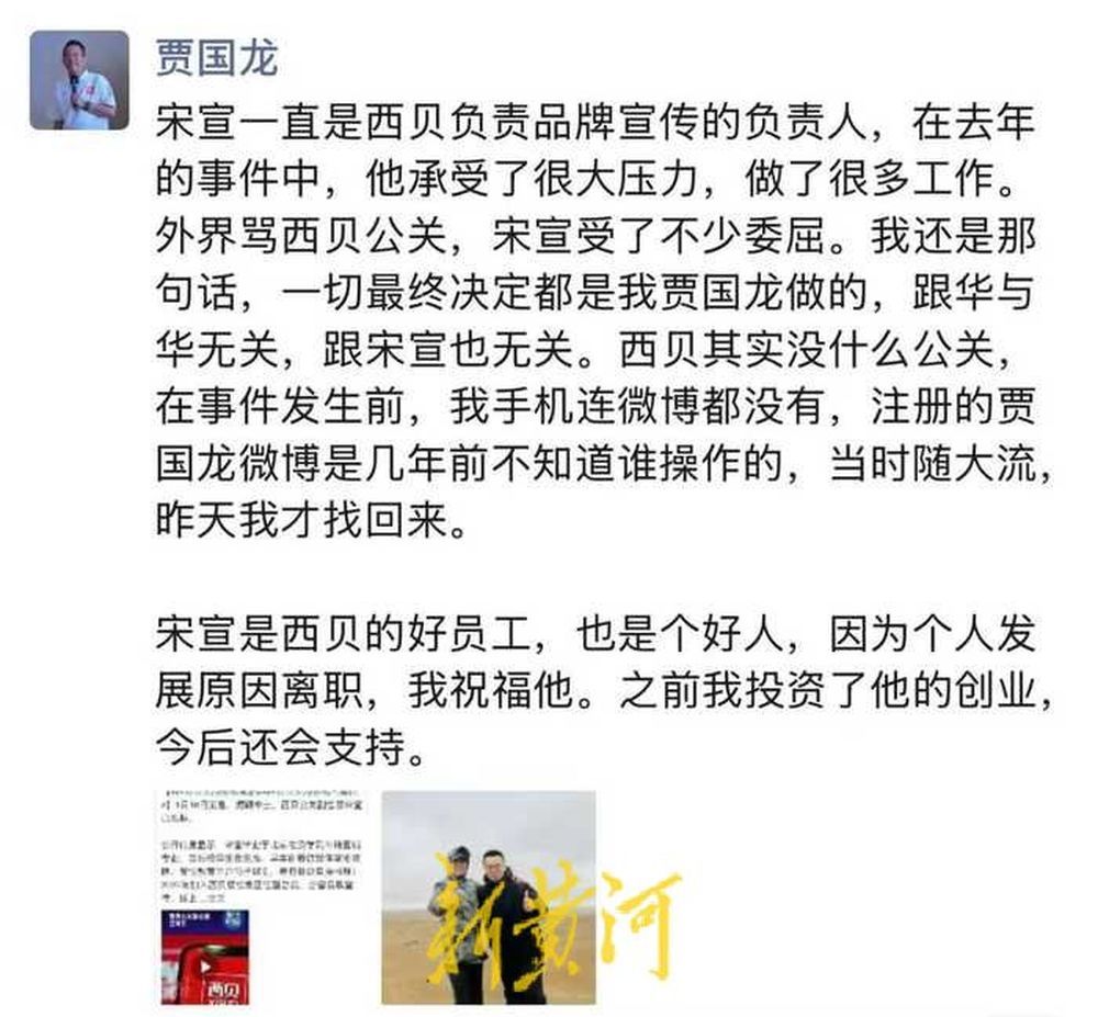 12时许,宋宣转发贾国龙朋友圈截图证实离职。贾国龙在朋友圈提到,宋宣因个人发展原因离职,此前投资了他的创业,今后还会支持。