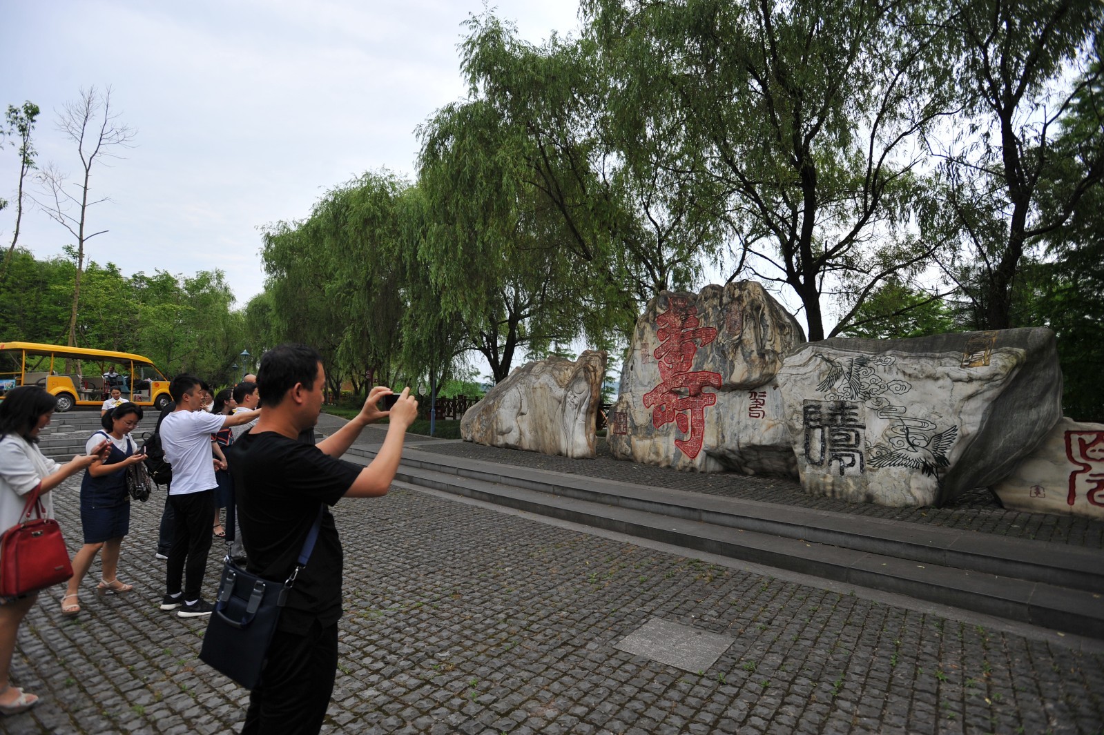 参观采访百寿园中,不少爱好书法的嘉宾对各位书法名家的字体倍加关注,有的凝视许久,有的合影留念,有的干脆以手作笔,现场随着字雕的金钩铁划描摹起来。百余个石碑,各个都有人聆听着书写着的传说。