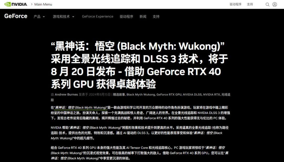作为首个国产3A大作,英伟达给足了排面,为《黑神话:悟空》专门发布新版驱动,支持全景光线追踪和DLSS 3,可使用帧生成技术获得超高画面和帧率。尽管这是大多数3A游戏发布前英伟达的常规操作,但也足以看出其对于《黑神话:悟空》的看好与支持。