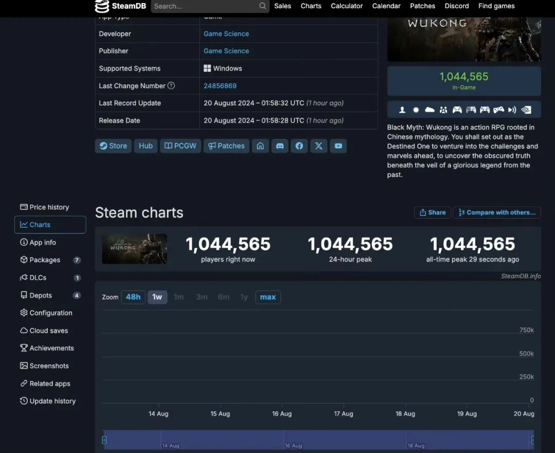 上线一小时后,《黑神话:悟空》Steam在线人数突破一百万人。