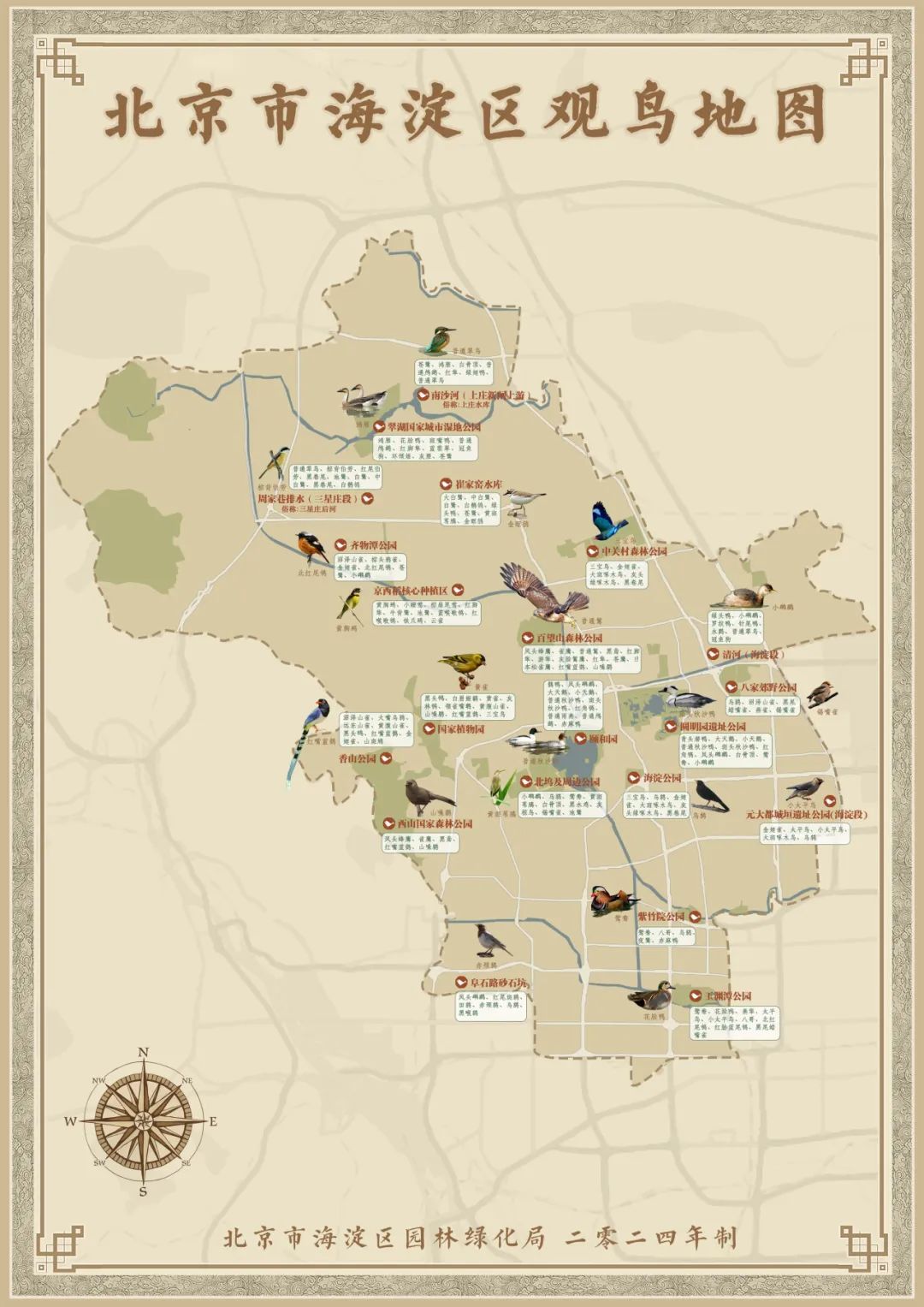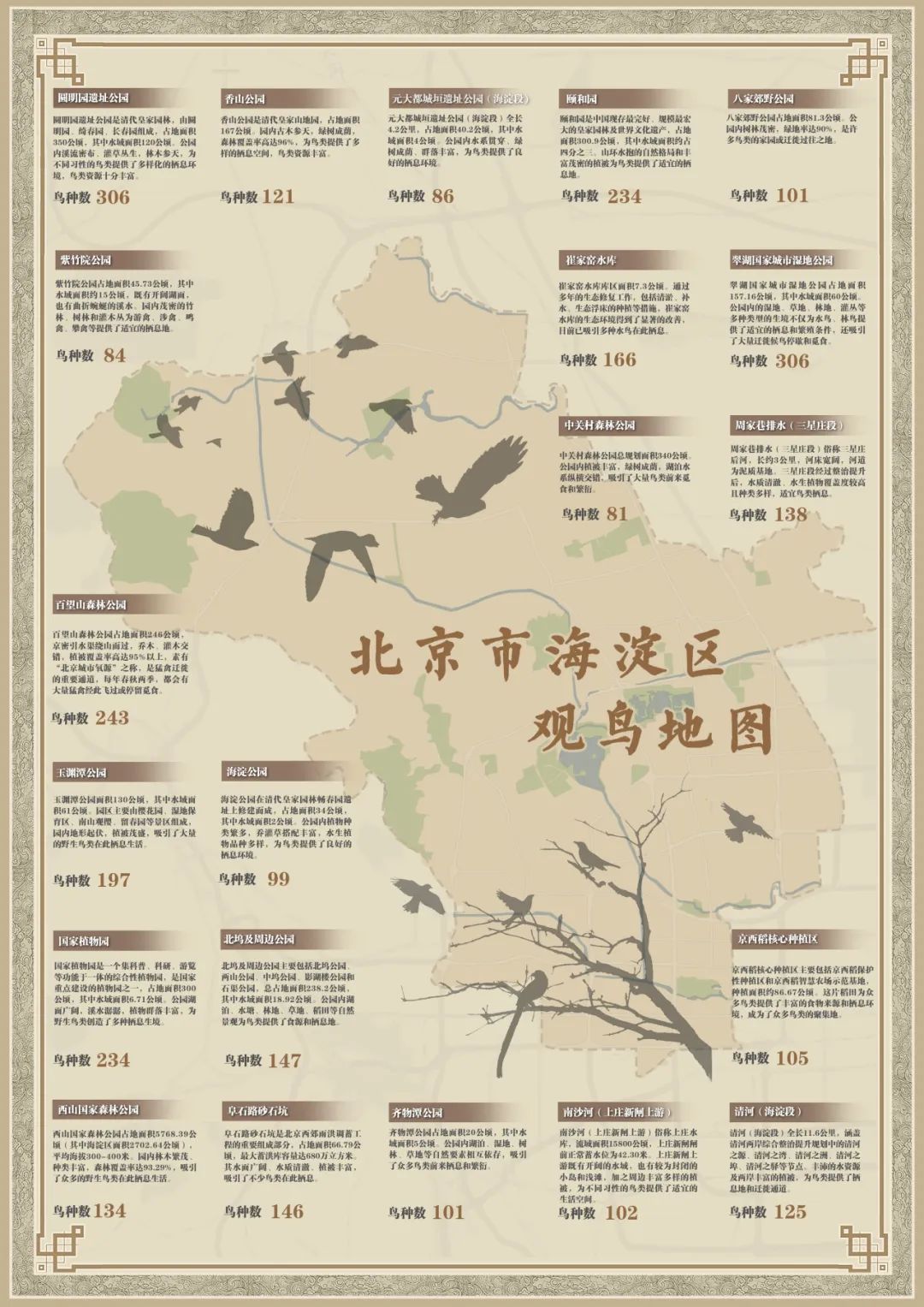 今年10月,海淀区园林绿化局正式发布《海淀区观鸟地图》,涵盖颐和园、圆明园遗址公园、翠湖国家城市湿地公园等21处鸟类资源丰富的观鸟点位。