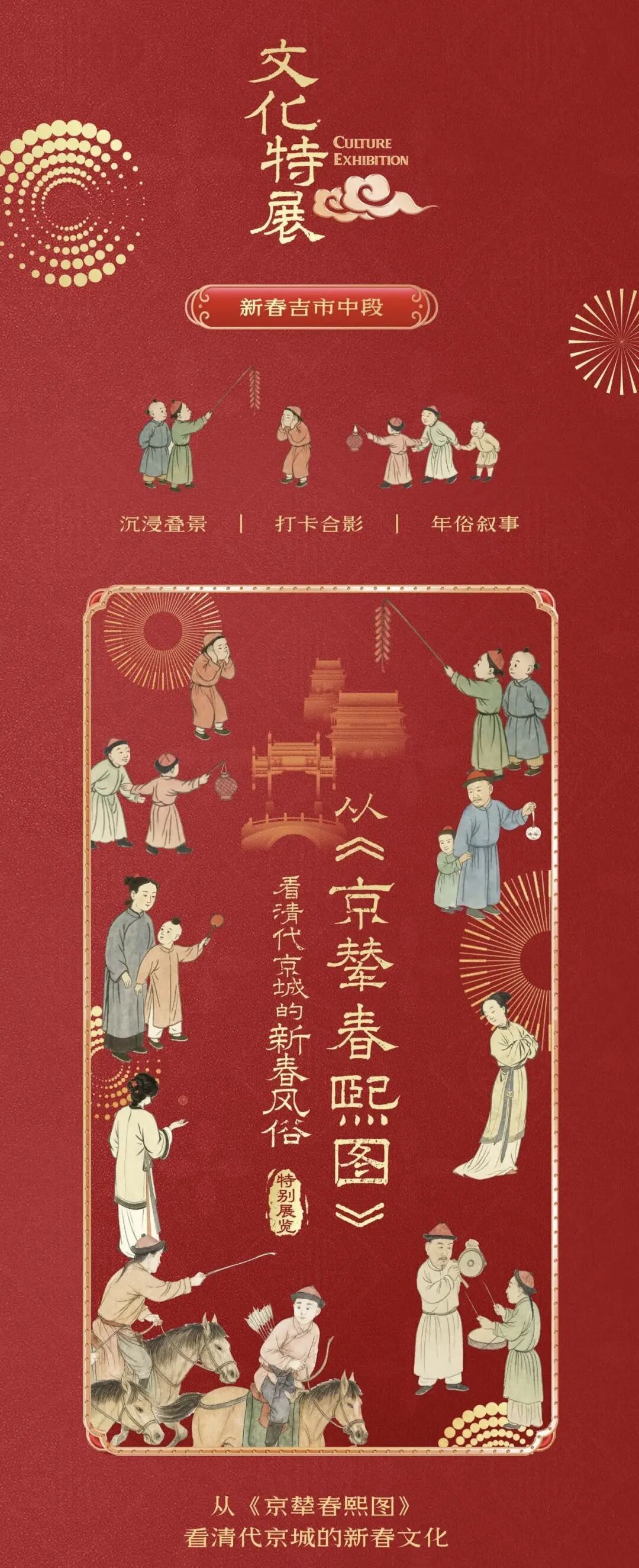 春节期间,荷花市场步道汇聚40多家商户摊位,供应年味小吃、主题年货及特色文创。同步举办新春文化特展,再现古画中的京城年俗场景,打造沉浸式文化空间。蓟城山水集团副总经理徐建介绍,通过把清代画家黄钺的《京辇春熙图》场景在荷花市场进行再现,让游人逛荷花市场的同时,营造打卡的点位,也能让大家感受传统文化过节的场景。