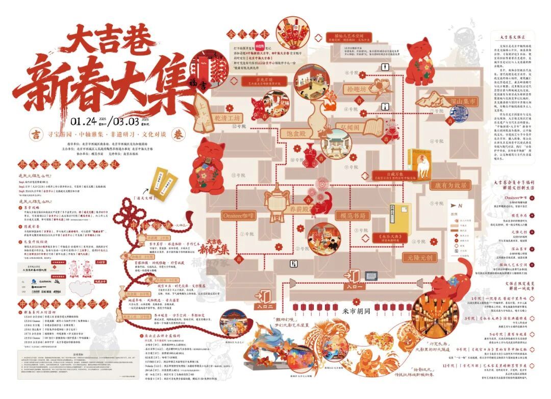 北京中海大吉巷副总经理付翔介绍,“中轴新韵大吉年”活动将持续到3月3日(元宵节)。今年春节活动,大吉巷联合故宫日历做了文化体验集合,出了两个道具,一个是报纸,把文保区按照不同的主题做了不一样的院落,模范书局做的永乐大典的典籍展,12号院做了故宫日历的画展,另外出了一个大吉年的通关文集,用集章的形式换取礼品。