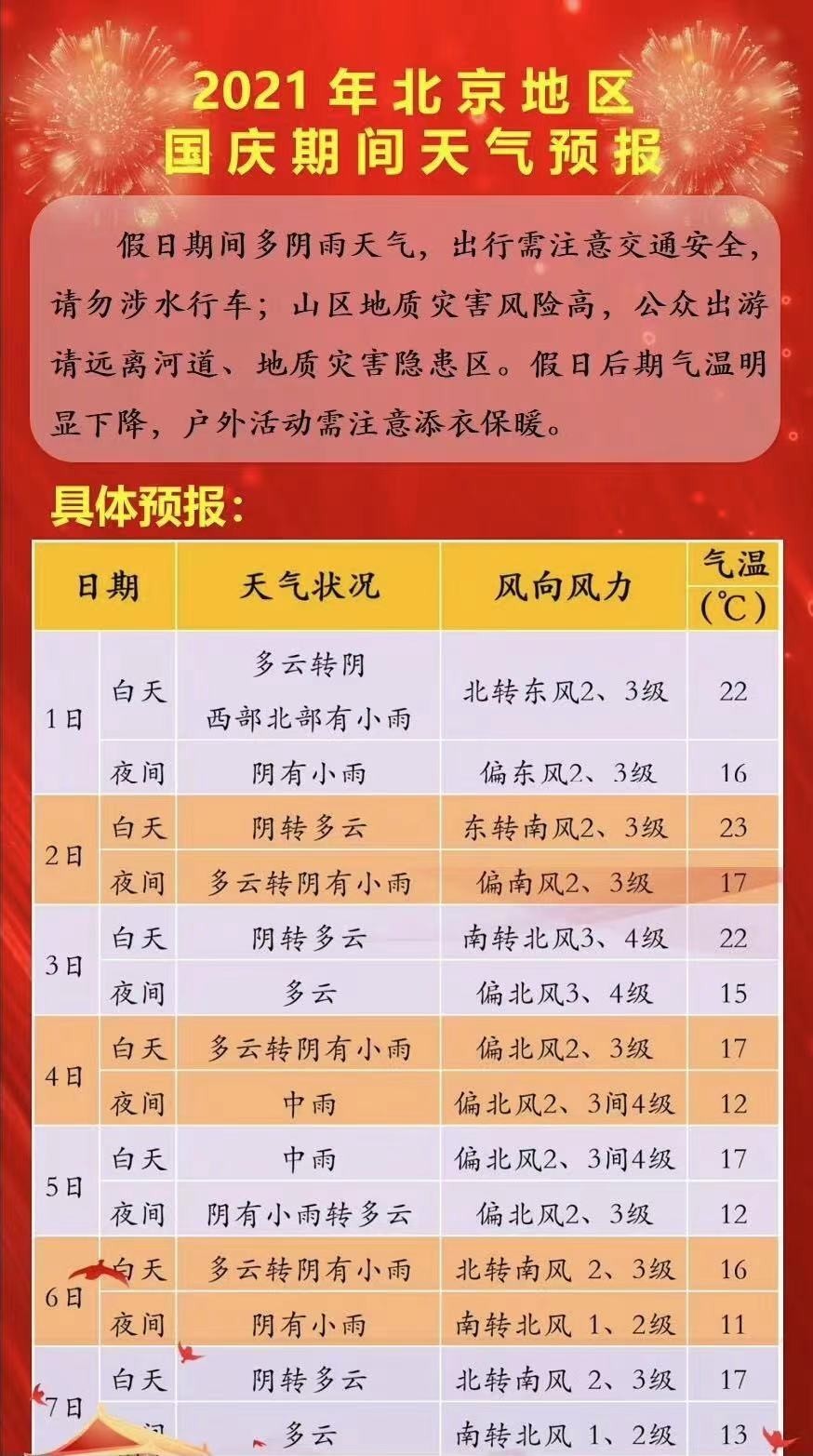 北京地区假日未来几天多阴雨天气,出行需注意交通安全,请勿涉水行车;山区地质灾害风险高,公众出游请远离河道、地质灾害隐患区。