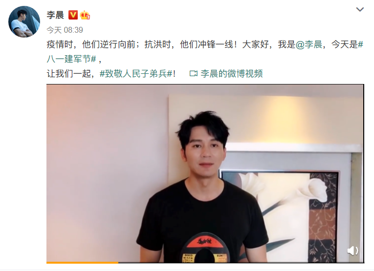 在《士兵突击》这部展现军人群像的电视剧中,李晨塑造的青年少校吴哲戏份不算多,但其幽默与锋芒令人印象深刻。在这个属于军人的节日里,李晨特别提到了英雄们危急关头的义无反顾:“疫情时,他们逆行向前;抗洪时,他们冲锋一线!让我们一起致敬人民子弟兵!”