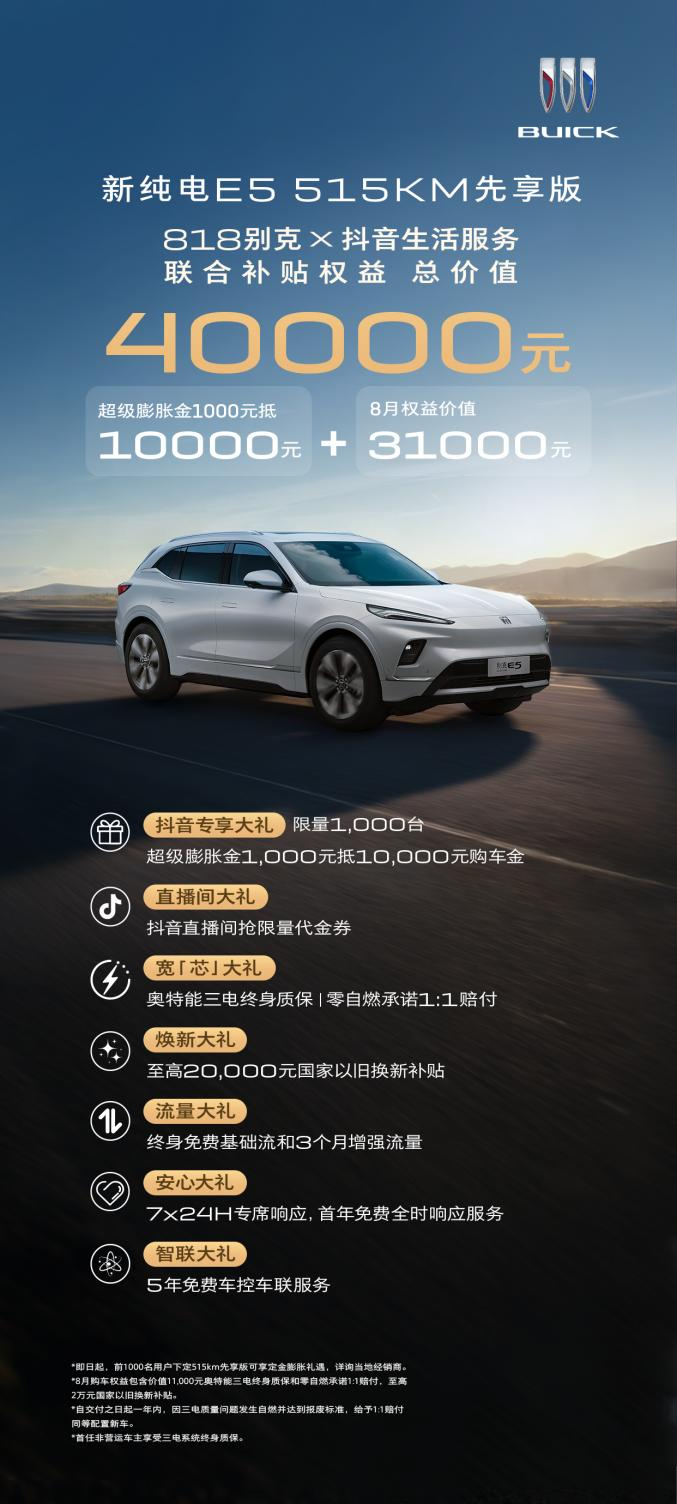 2025年8月16日,“别克818购车节” 启幕,新别克纯电E5放出重磅福利。该车以15亿公里零自燃成绩刷新行业纪录,更推出限量千台的七重大礼。