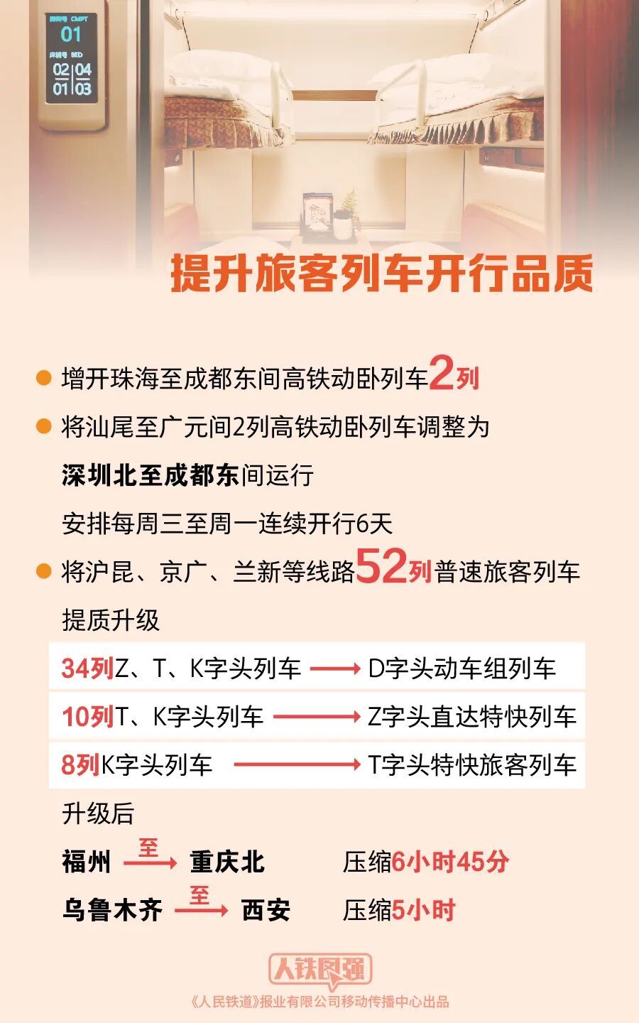 五是统筹利用线路能力和装备资源,提升旅客列车开行品质。优化成都至珠海、深圳间高铁动卧列车开行方案,增开珠海至成都东间高铁动卧列车2列,将汕尾至广元间2列高铁动卧列车调整为深圳北至成都东间运行,安排每周三至周一连续开行6天,夕发朝至优势更加明显;将沪昆、京广、兰新等线路52列普速旅客列车提质升级,其中34列Z、T、K字头列车升级为D字头动车组列车,10列T、K字头列车升级为Z字头直达特快列车,8列K字头列车升级为T字头特快旅客列车,升级后在相同运行区段内列均旅行时间可压缩1小时42分,其中福州至重庆北、乌鲁木齐至西安分别压缩6小时45分、5小时。继续开好公益性“慢火车”和乡村振兴列车,满足边远地区群众出行需求。