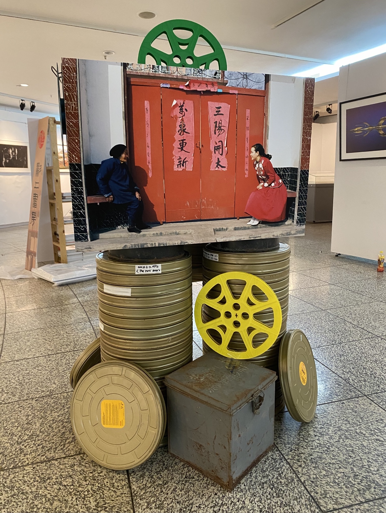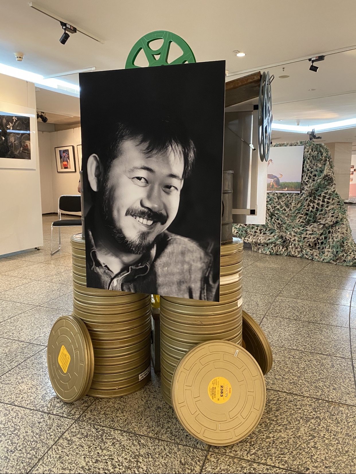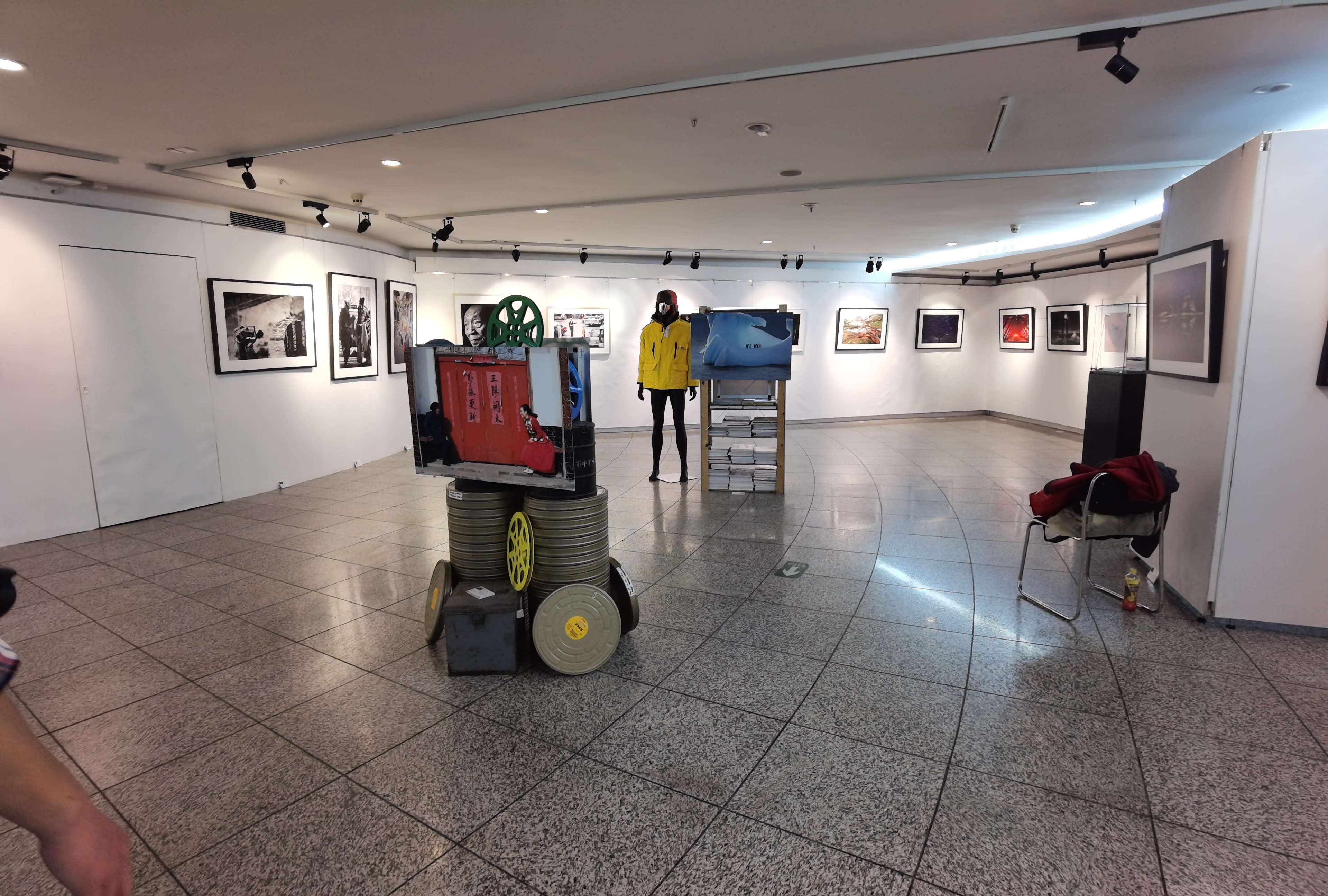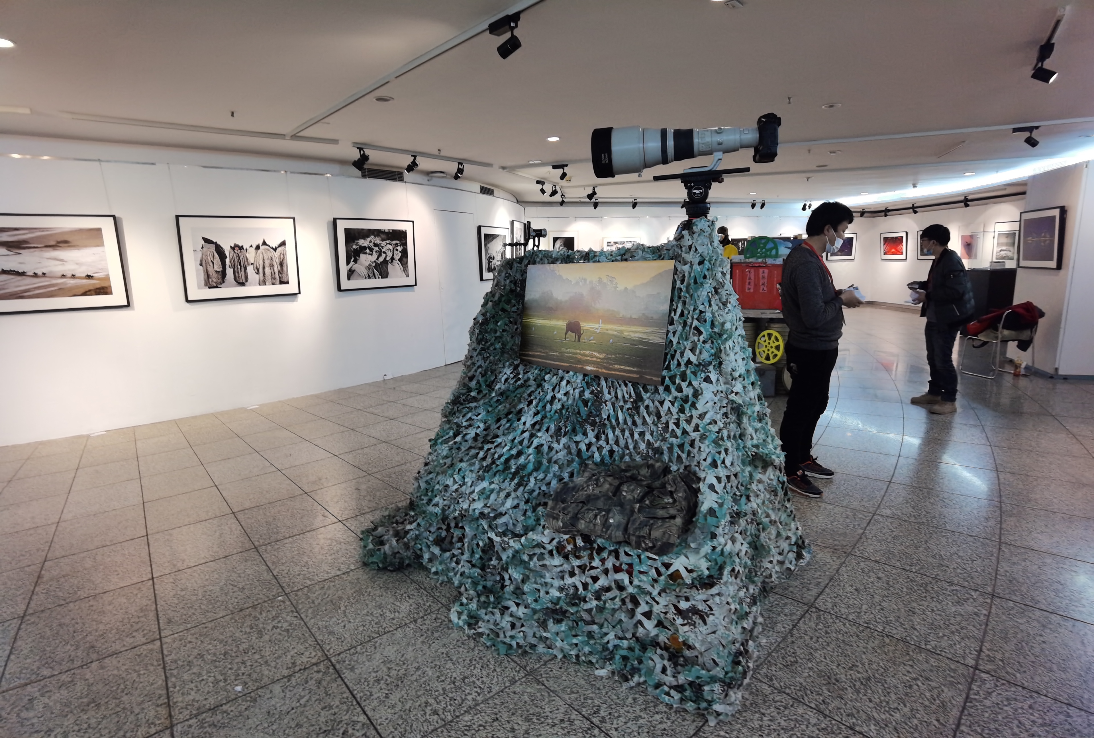 在这摄影展上,你不仅能在展厅墙上,看到老、中、青53位摄影家们的100多幅优秀摄影作品,还能在展厅中央,看到9个“个性化立体展位”上的摄影佳作。有挂在建筑脚手架上的镜框里,表现建筑工人火热工作的“工地上的战地摄影师何慷民”摄影作品;而摆在老电影胶片铁盒之上的“人物肖像”,是《大众电影》老摄影师张甦妍的佳作;两幅青藏高原摄影作品,摆在了三本30公分后的“世界上最厚、最重的摄影图文书——《喜马拉雅》”之上,那是37年,66次奔赴西藏,拍摄青藏高原的摄影家张超音的力作;两幅体育比赛摄影作品旁,有体育摄影师刘占坤五次参加足球世界杯、以及奥运会的记者证、大力神杯、和采访工作时的摄影背心……
