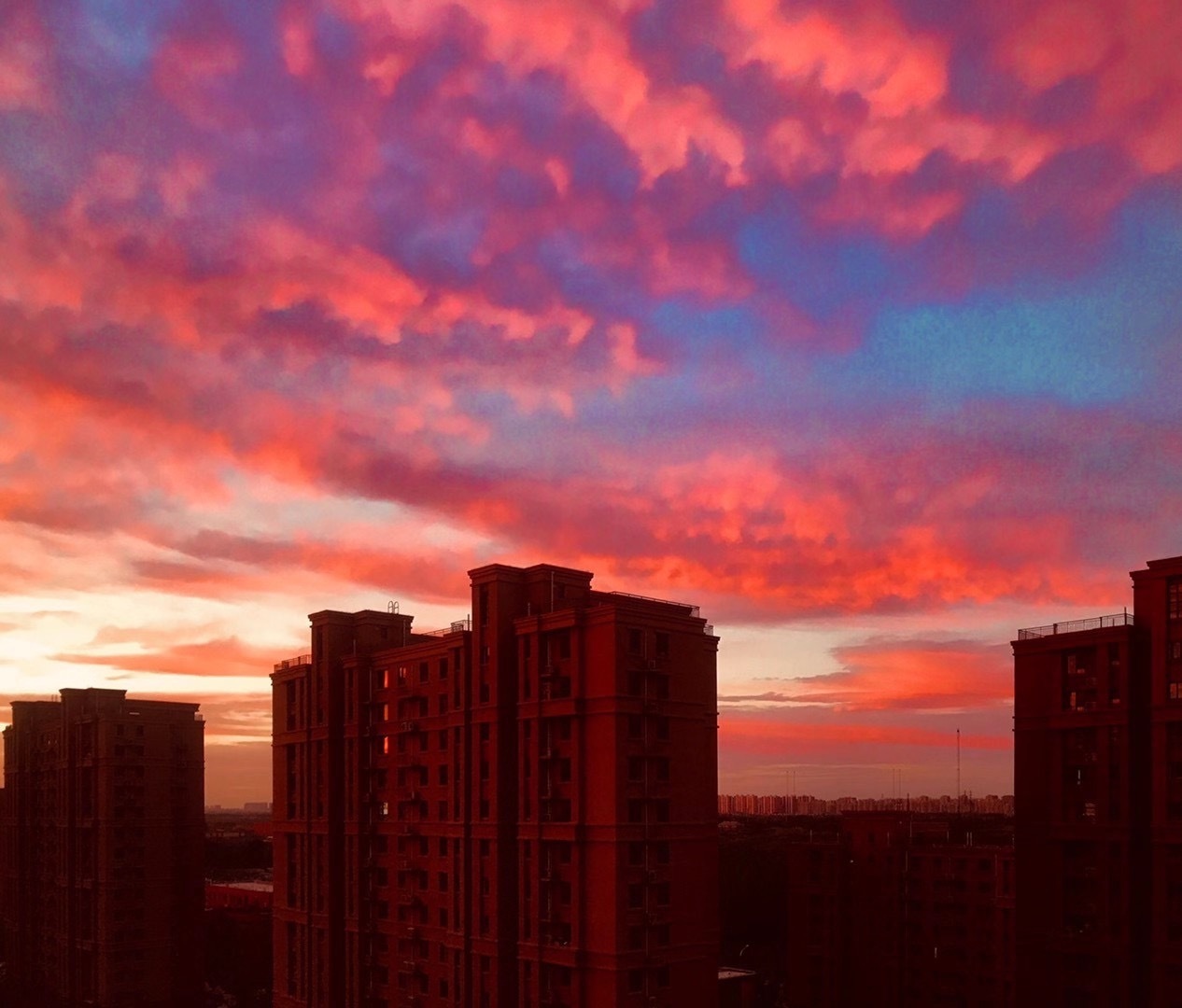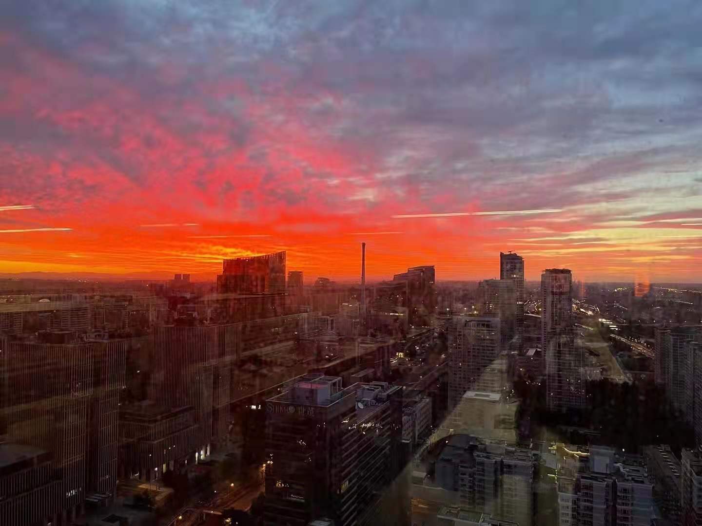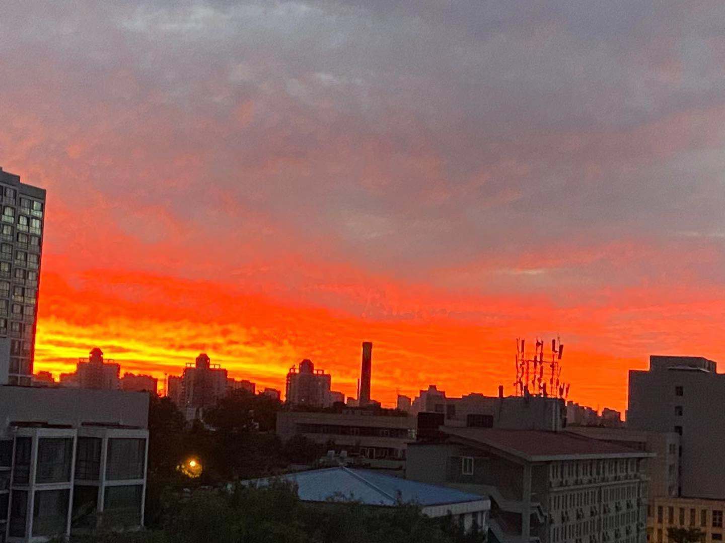 日出东方红胜火!北京今晨绝美朝霞 市民记录下天空染红全过程。