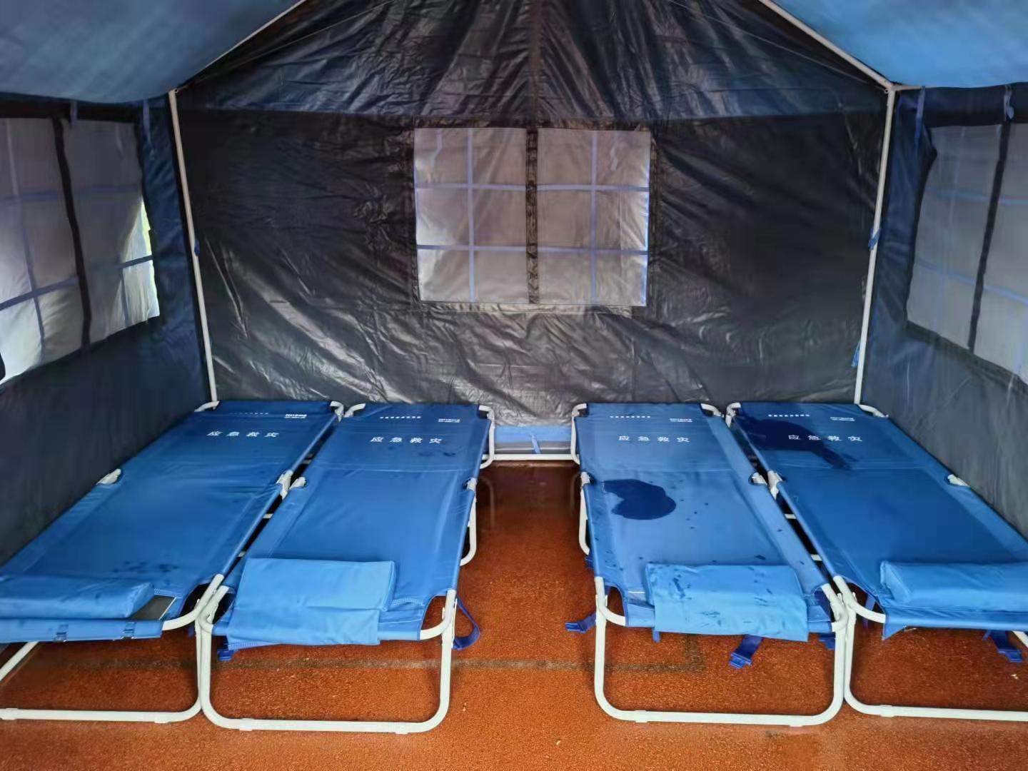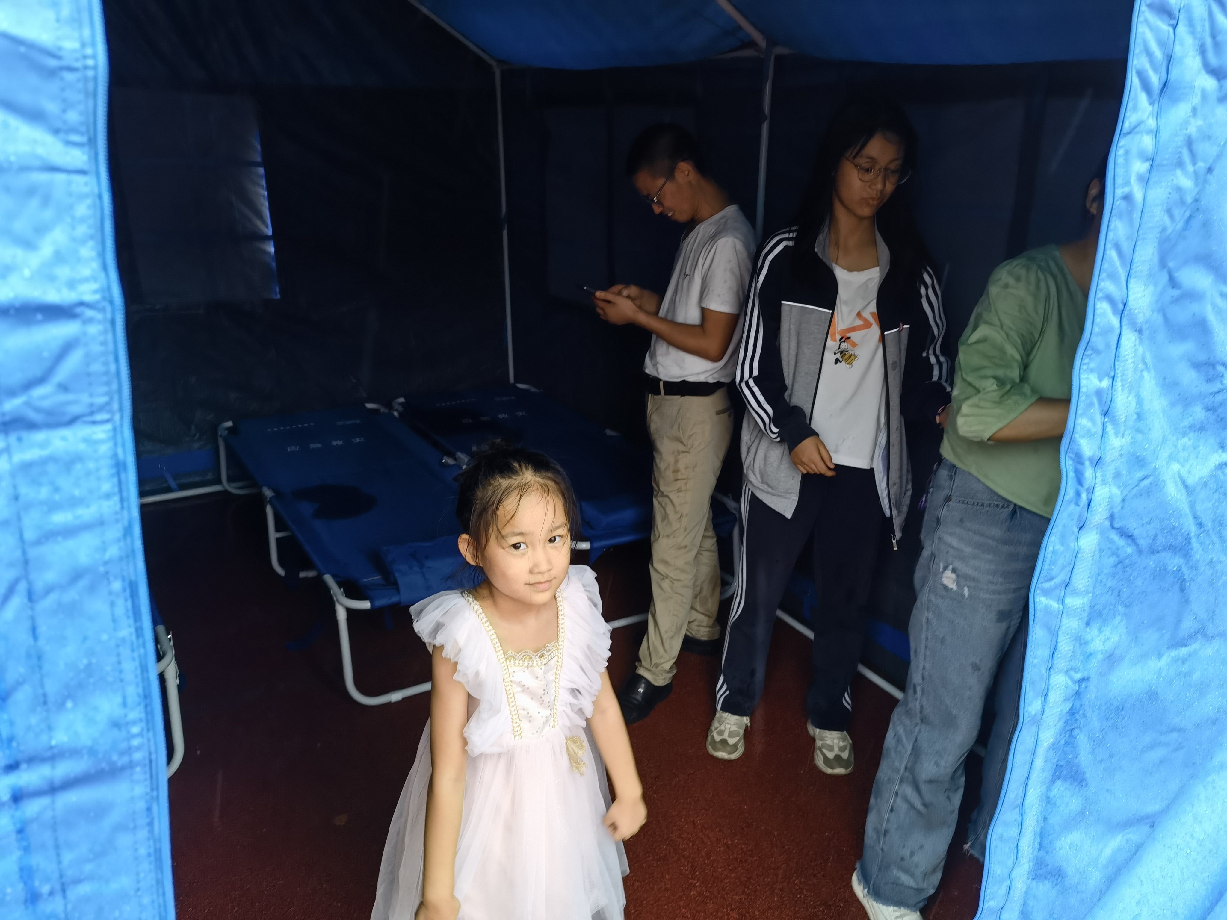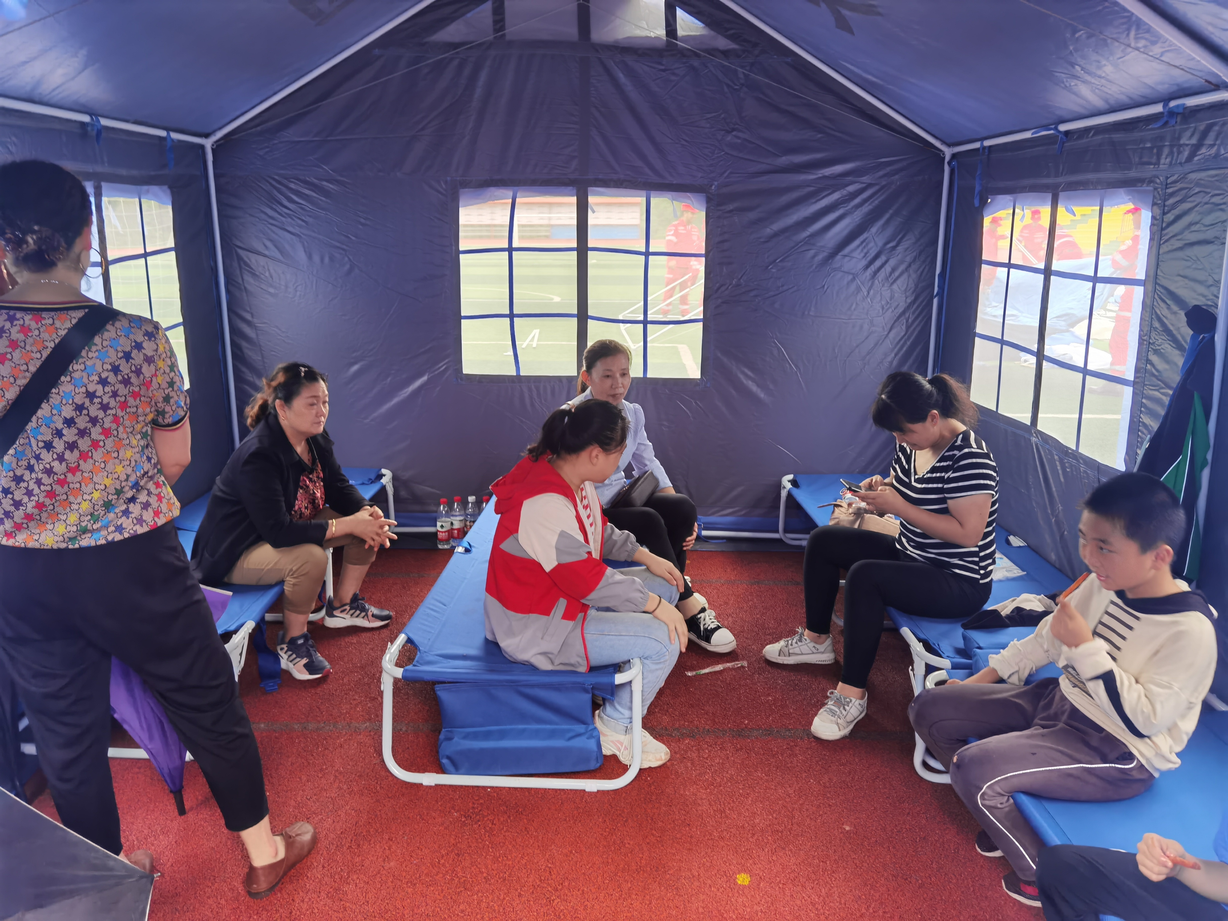 全天在城北小学和城东小学两个地点共搭设帐篷105顶,城北小学安置点设置安置床铺50张,搬运物资共计170件。