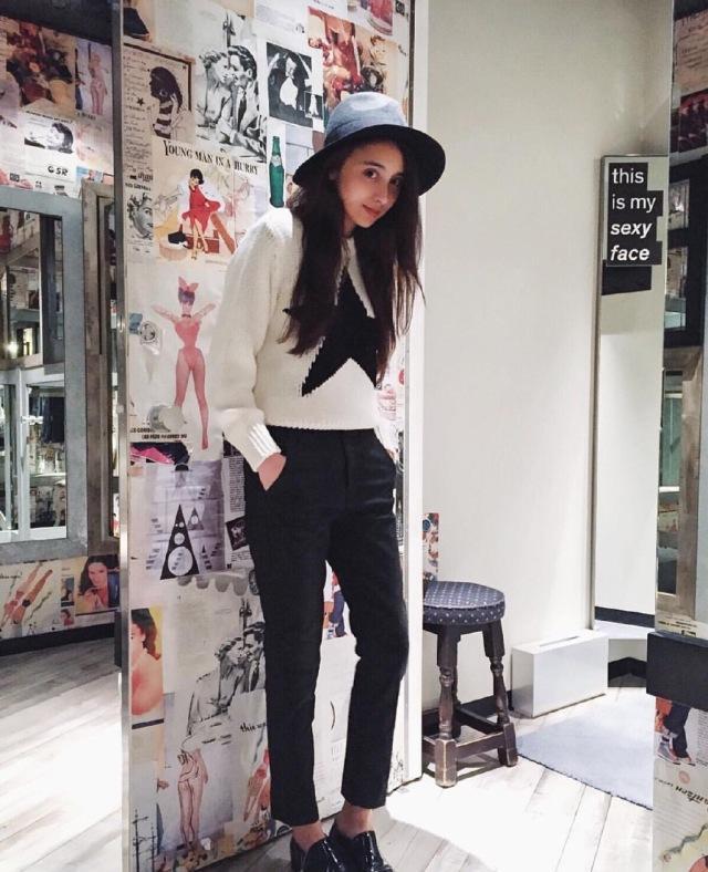 翻开她的私照你会发现,发际线真不是一般的高。。。所以会显得额头很宽,有时候她戴起帽子修饰一下,效果会好很多,脸也小了一大圈,额头比较宽的妹子们可以学习一下哦!(敲黑板)