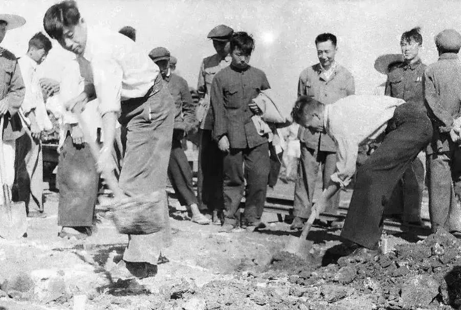 饶斌把第一锨黑土抛向奠基石