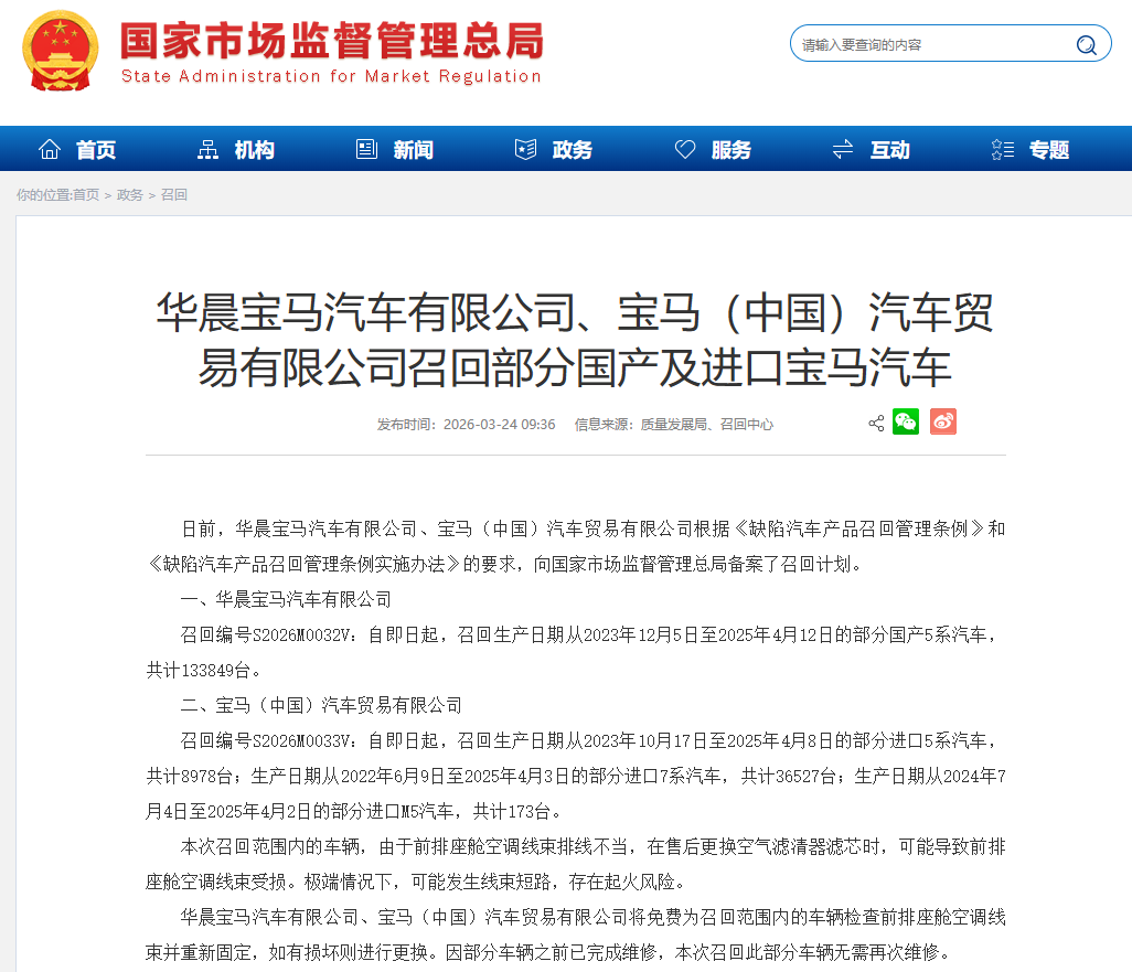 3月24日,据国家市场监督管理总局网站消息,日前,华晨宝马汽车有限公司、宝马(中国)汽车贸易有限公司根据《缺陷汽车产品召回管理条例》和《缺陷汽车产品召回管理条例实施办法》的要求,向国家市场监督管理总局备案了召回计划。