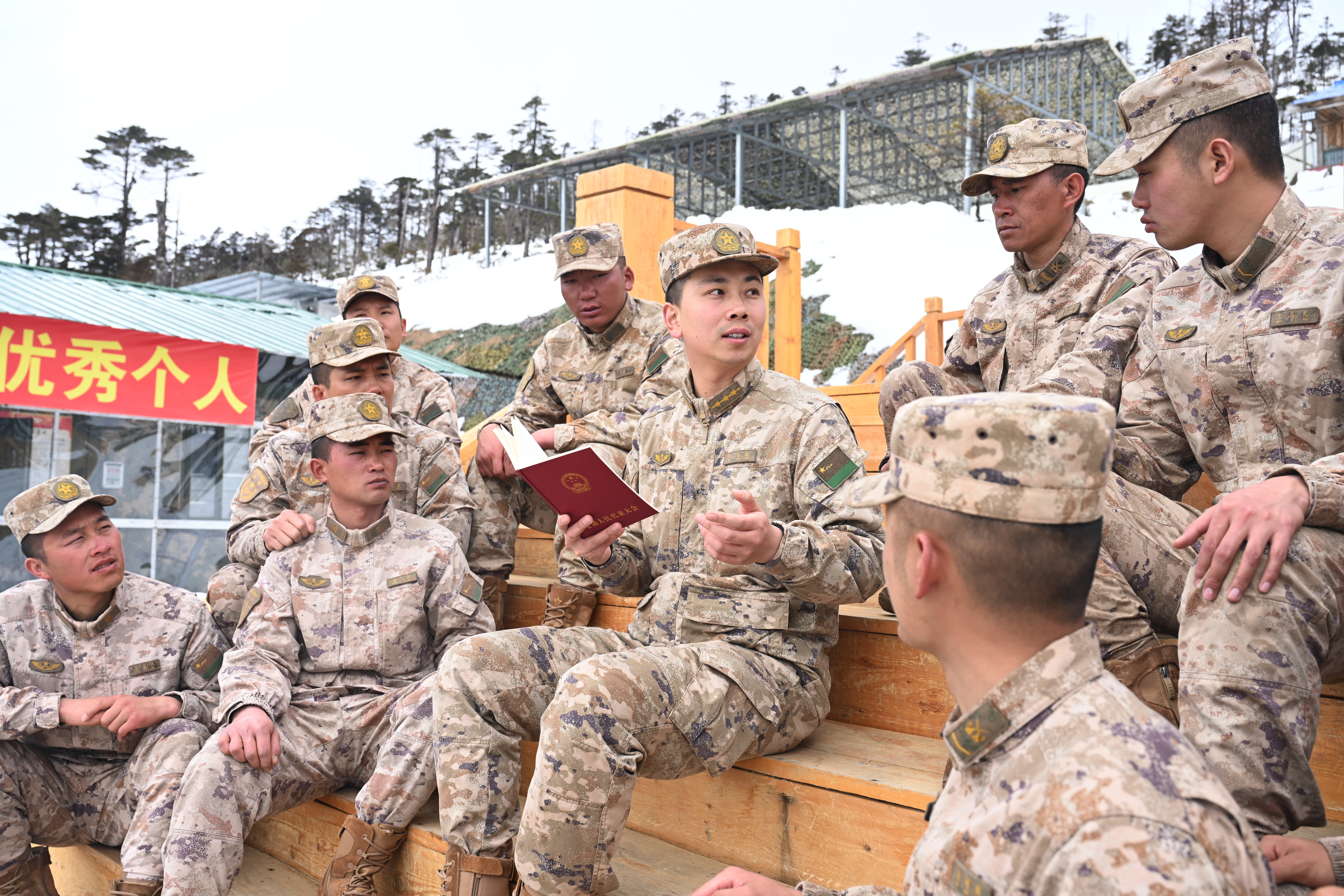 4月,喜马拉雅山脉南麓,雪映雄关,暖阳高照。西藏军区“墨脱戍边模范营”某哨点官兵围坐在国旗杆下,与海金航展开两会精神学习交流。