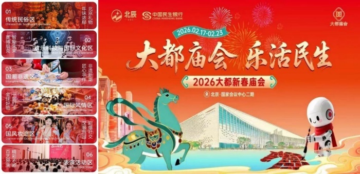 大都庙会活动落位中轴线北延长线上的“国家会客厅”——国家会议中心(二期)。庙会以“国家会客厅,百姓喜乐荟”为主题,玩出三大花样:科技感拉满,AR体验、机器人互动;国际范十足,邂逅全球新春年味儿,让异国风情碰撞中式新春;中国味更浓,汉服巡游、糖画面人剪纸非遗手作全上阵,随手一拍就是年味大片。