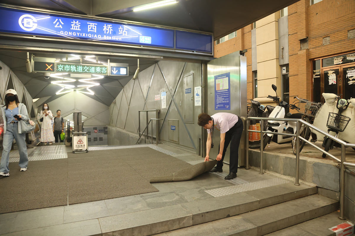 各车站密切关注降雨情况,及时在出入口、通道等关键位置铺设防滑垫,设置提示牌,提醒乘客注意安全,并在客流高峰时段,利用车站广播系统和乘客信息显示系统及时发布出行提示。同时,车站还准备了一次性雨衣,视雨情及时为乘客发放,为乘客提供贴心的雨天出行服务。