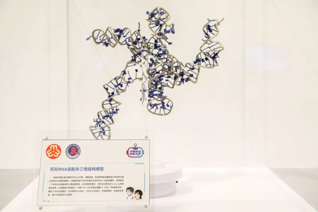 陈玲玲团队通过阐明环形RNA折叠、降解机理,发现其特殊折叠抑制天然免疫并提出环形RNA适配体概念。该模型是基于陈玲玲团队对环形RNA二级结构解析,所预测的一个环形RNA适配体的三维结构模型。如该模型所展示,环形RNA易形成16-26 bp双链茎环结构,从而能结合免疫因子一双链RNA活化的蛋白激酶 R(PKR)并抑制其活性,避免了PKR过度激活;且与线性RNA相比,环形RNA更稳定,制备更便利,免疫原性更低,便于开发新型RNA药物。