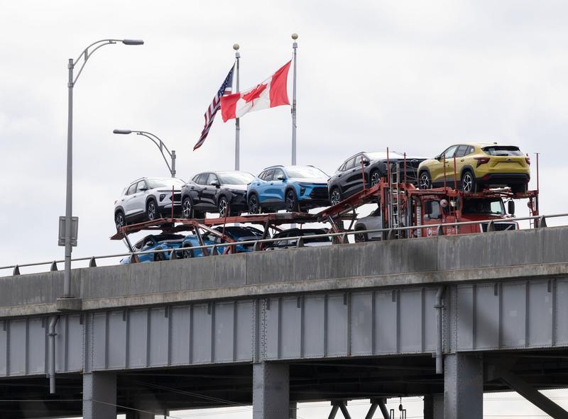 4月9日,在加拿大安大略省尼亚加拉瀑布市加美边境地带,一辆满载的汽车运输车通过刘易斯顿-昆斯顿桥开往加拿大。新华社发(邹峥摄)