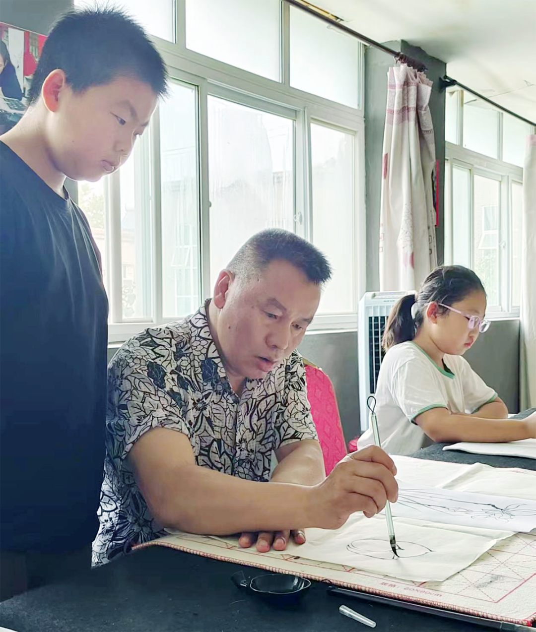杨志鹏深受父亲的影响,从小学习书法,获得过许多奖项,对苏轼的字体和行书颇有研究。大学毕业后,他跟随父亲的脚步,走上了公益教学之路。工作之余,他会在画室教孩子们学习书法,通过“控笔”练习来提升他们的国画创作能力。他的教学方式生动有趣,吸引了越来越多的孩子慕名学习。