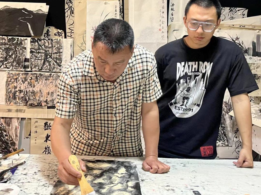 杨进军(左)与儿子杨志鹏(右)进行书画创作。