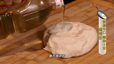 在面团里加入少许食用油,用双手揉捏,将油均匀地澄入面团中。