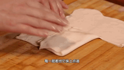 将醒好的面团擀成饼皮,在饼皮抹上一层油,在饼皮左右两侧各划上两刀,上下各划一刀,往里卷,形成多层四边形即可。最好每层都抹上少许油,防止粘连。