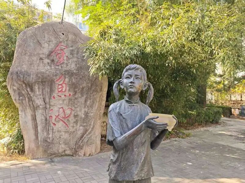 要说《龙须沟》这部作品中最令人惋惜的角色,莫过于在雨夜掉进沟里淹死的小妞子。而在金鱼池小区内部,我们还能看到小妞子的雕像。扎着两个小辫儿,手捧着最爱的金鱼缸,小妞子的眼神望向远方。但她眼前的景象早已不是“成群的跳蚤和数不过来的臭虫”,而是整洁的居民楼、蜿蜒的景观水渠和孩子们欢快的身影。从龙须沟到金鱼池,这里经历过三次巨变。史宁介绍: